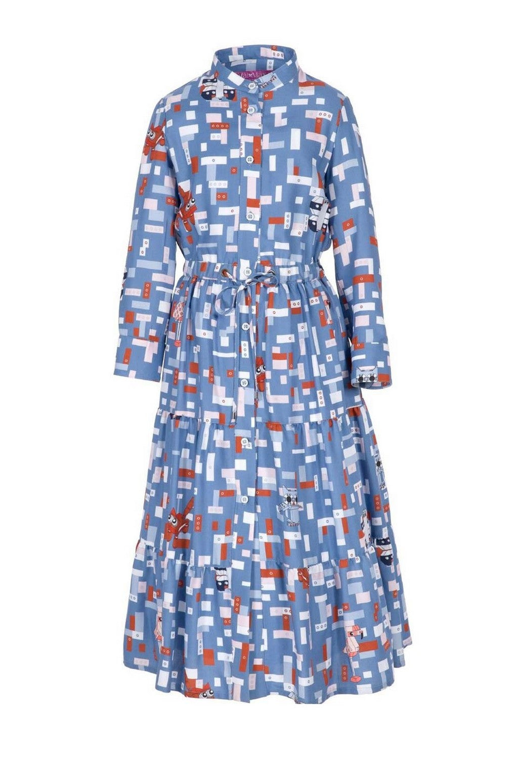 Long patterned shirt dress with long sleeves, drawstring waist and pleated skirt.