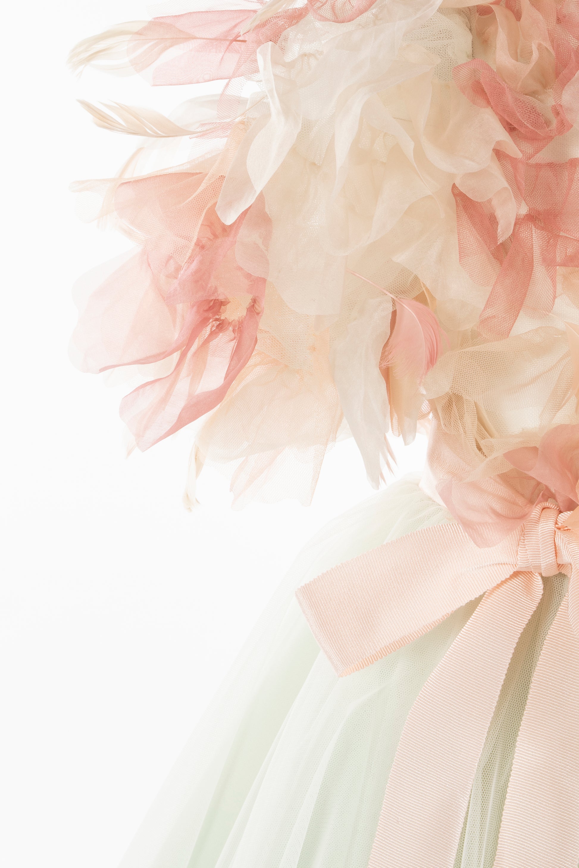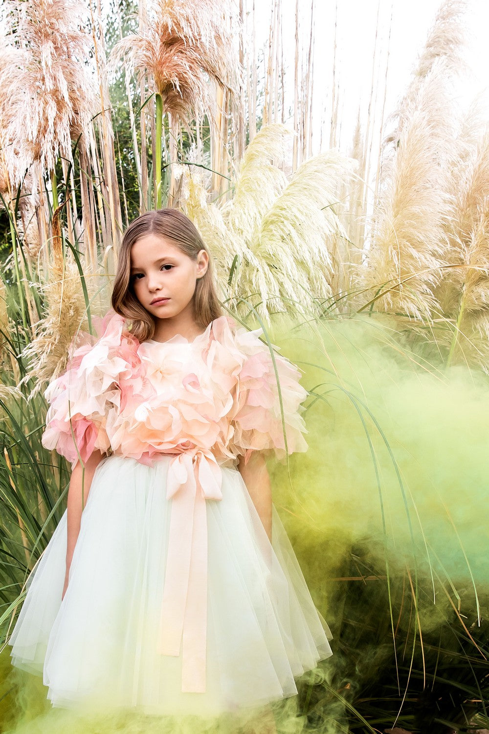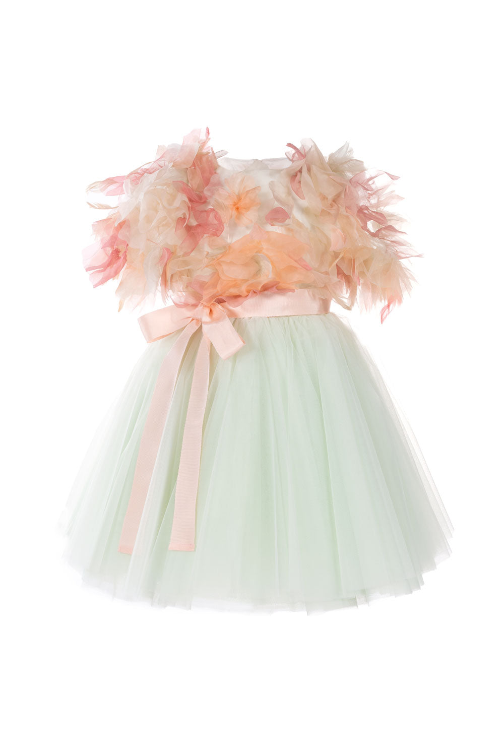 Abito da cerimonia bambina con corpino decorato da applicazioni floreali multicolore in organza e gonna in tulle verde chiaro. Completo di cintura in vita con fiocco, è l’outfit perfetto per matrimoni, feste ed eventi speciali.