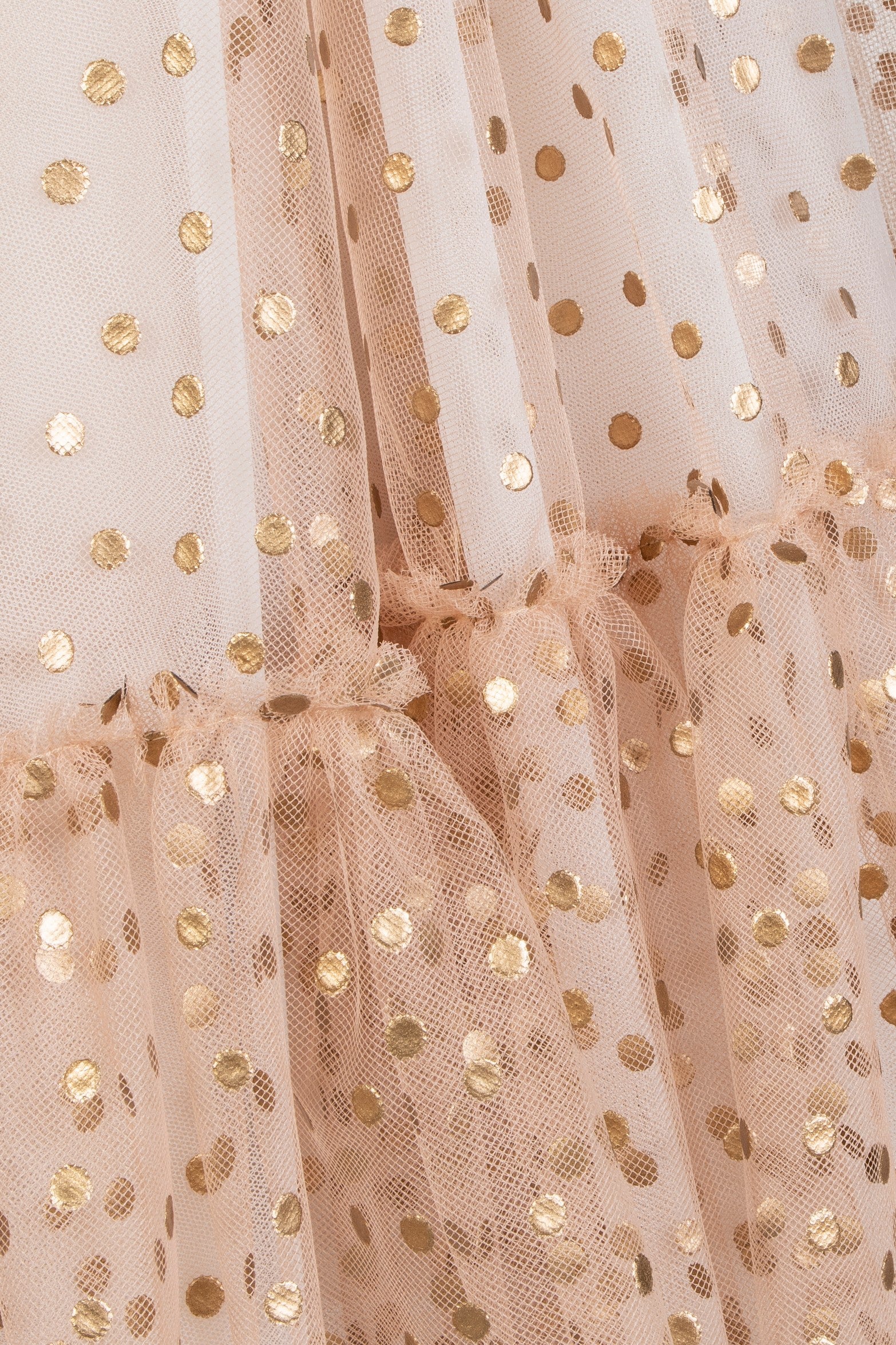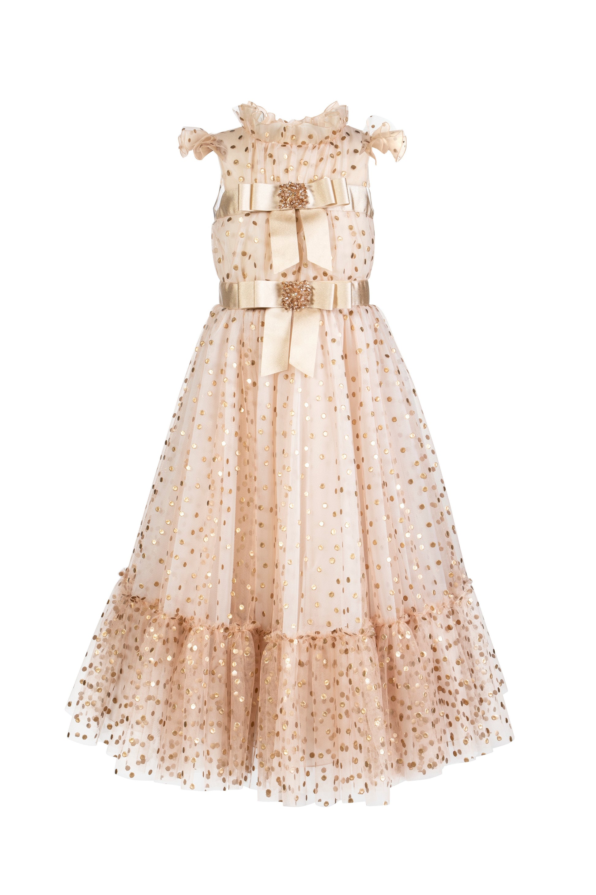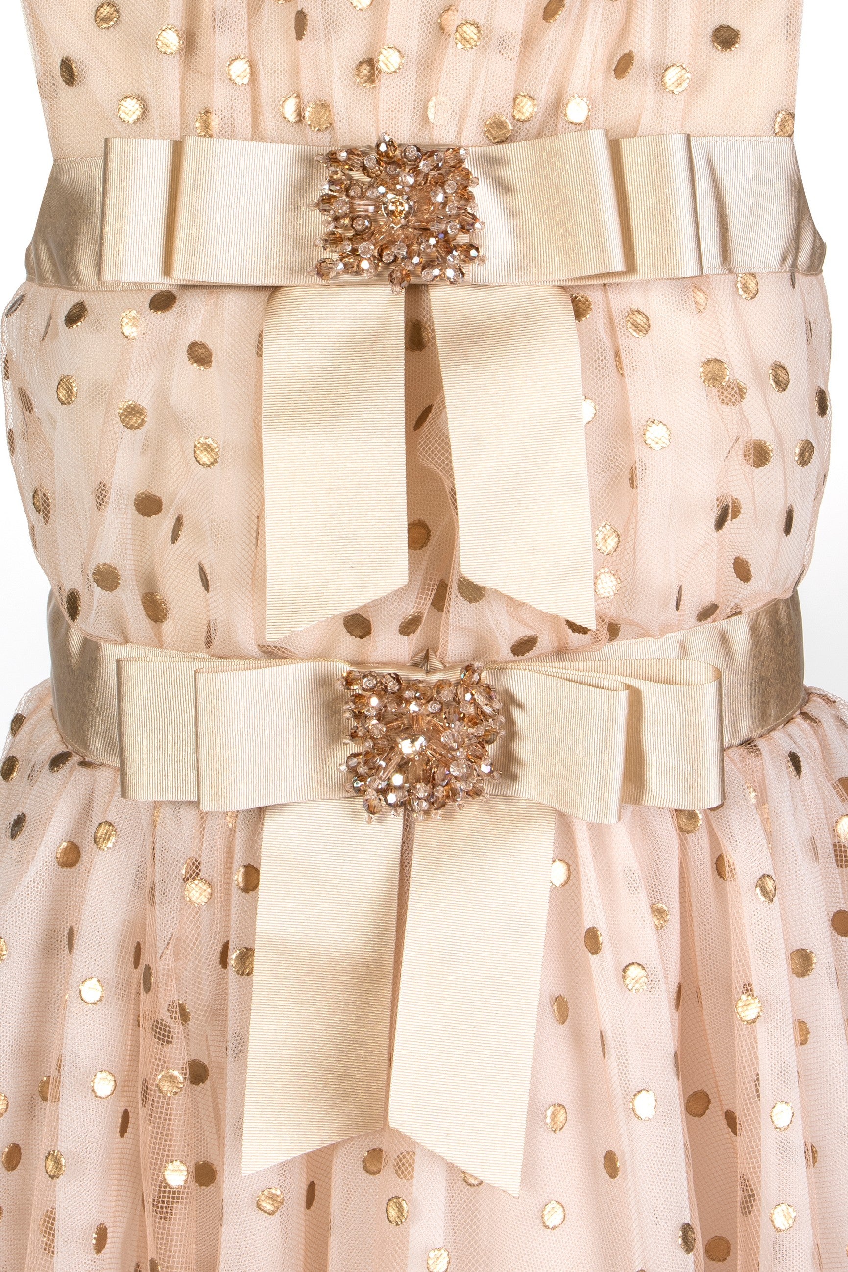 Linea romantica per l' abito couture in tulle color pesca. Animato da pois tridimensionali color oro, presenta due fiocchi in grosgrain e un prezioso ricamo di cristalli.