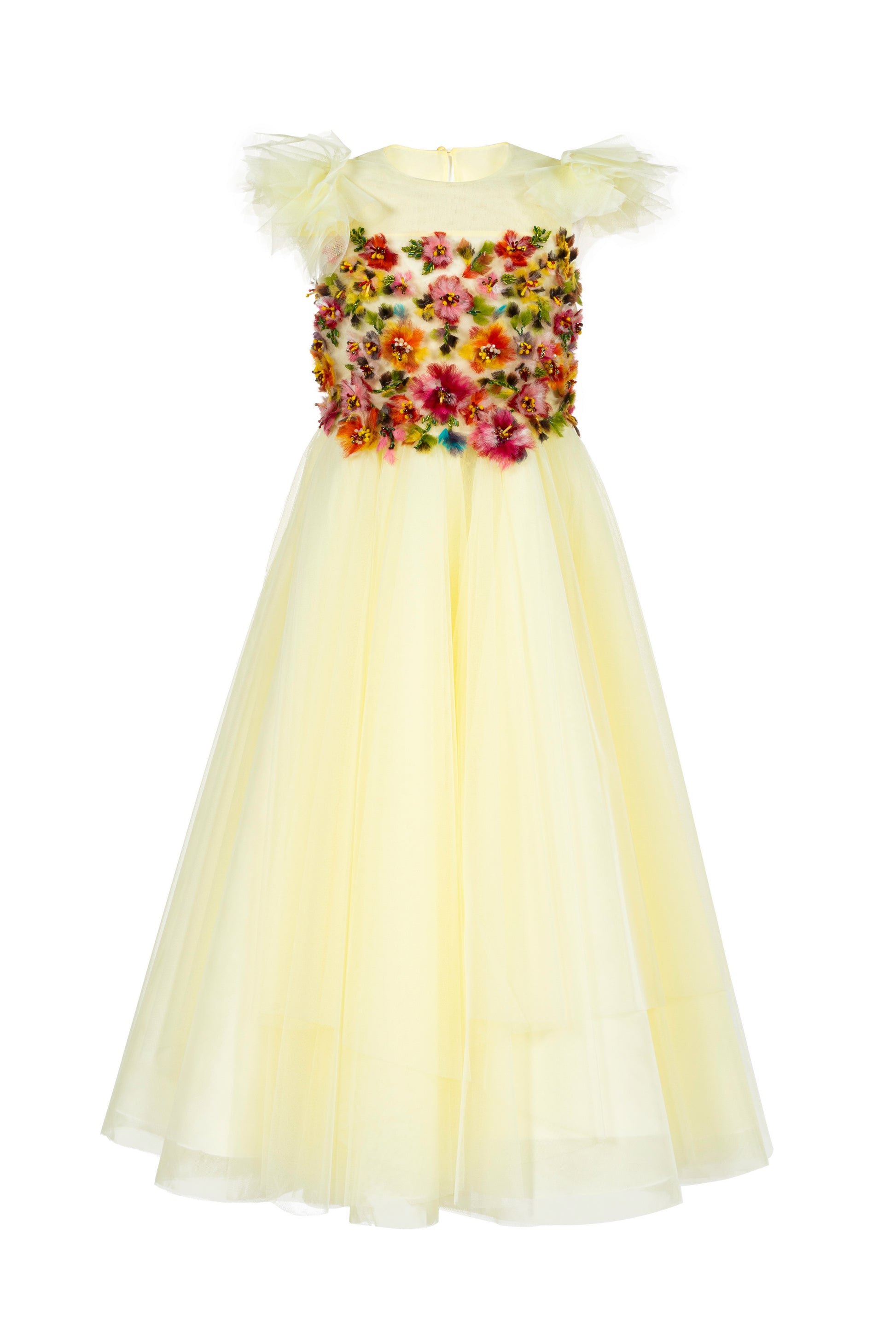 Abito da cerimonia per bambina, realizzato in tulle giallo. Corpino decorato con applicazioni floreali multicolore in rilievo, maniche corte a sbuffo e gonna ampia svasata a più strati per un effetto voluminoso. Chiusura posteriore con zip nascosta. Ideale per matrimoni, feste e occasioni eleganti.