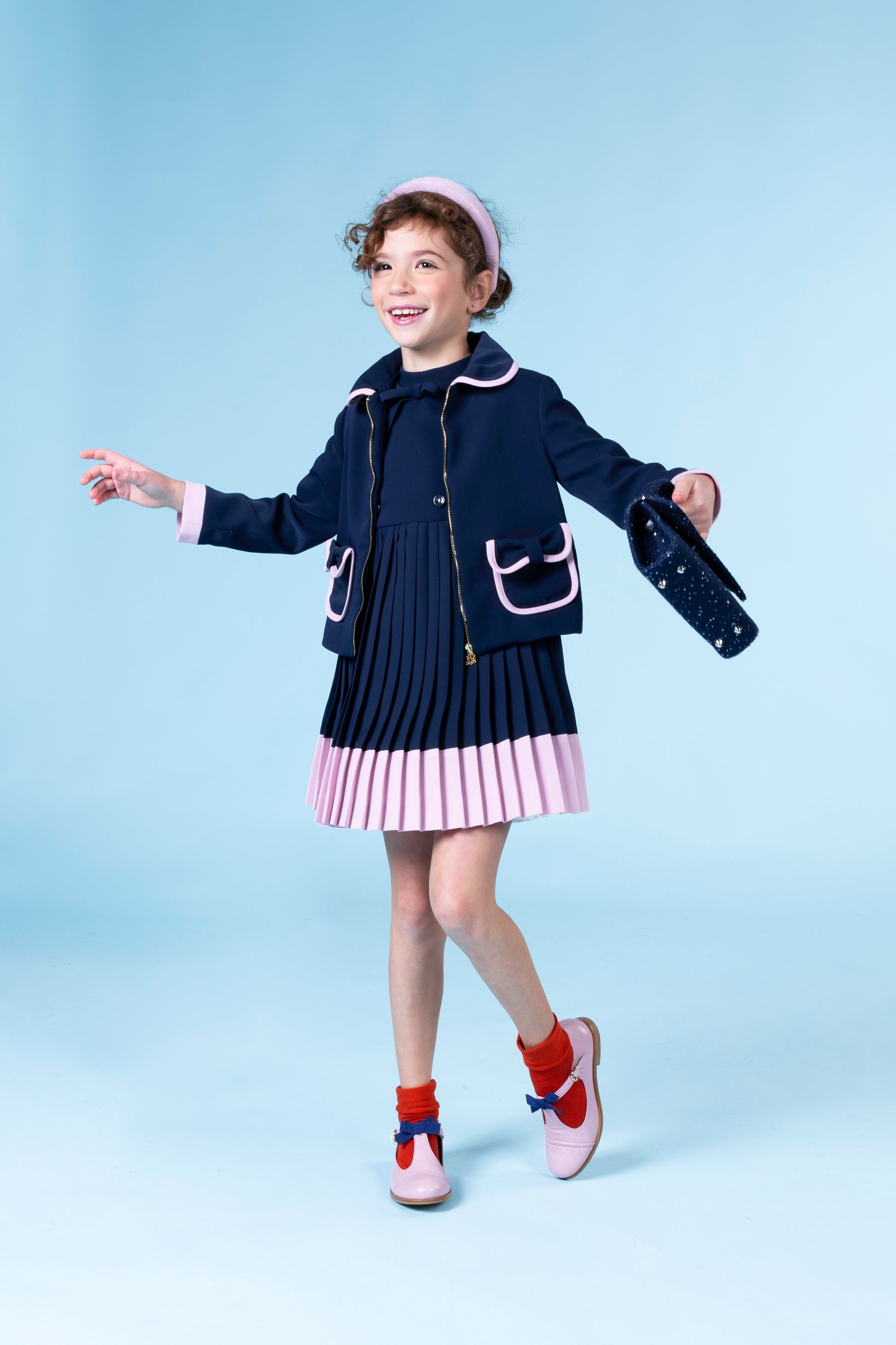 Raffinato e senza tempo, questo abito combina eleganza classica e delicatezza contemporanea. Realizzato in tessuto crepe fluido, presenta un corpino lineare arricchito da un piccolo fiocco sul collo e doppi bottoni decorativi. La gonna plissettata bicolore, blu nella parte superiore e rosa cipria sul fondo, crea un effetto di movimento armonioso e sofisticato. La chiusura con zip invisibile sul retro garantisce una vestibilità perfetta e confortevole.