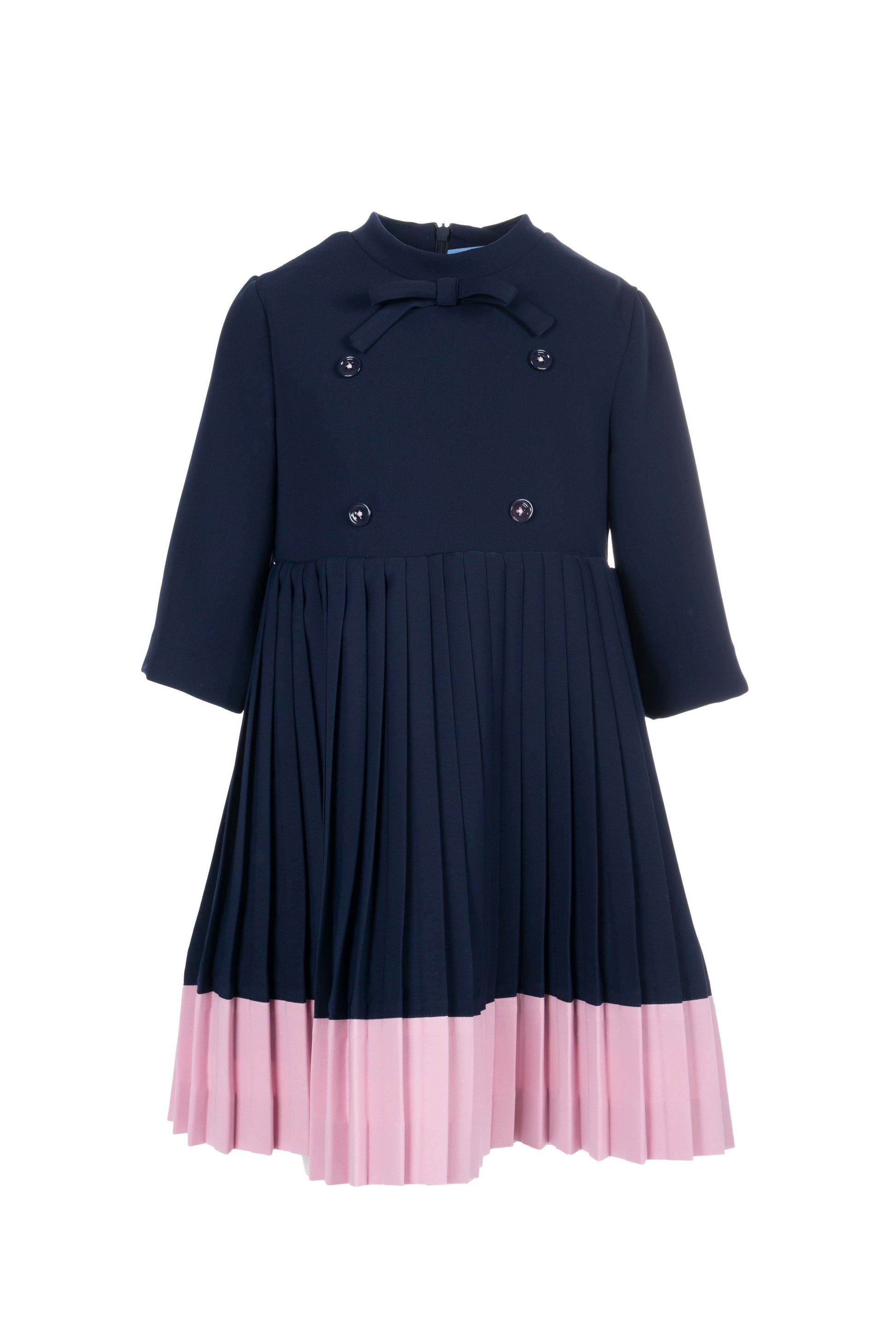 Design: Fiocco al collo, doppi bottoni decorativi, gonna plissettata bicolore