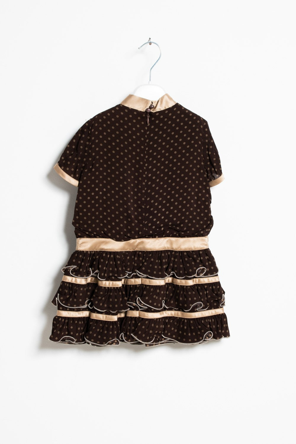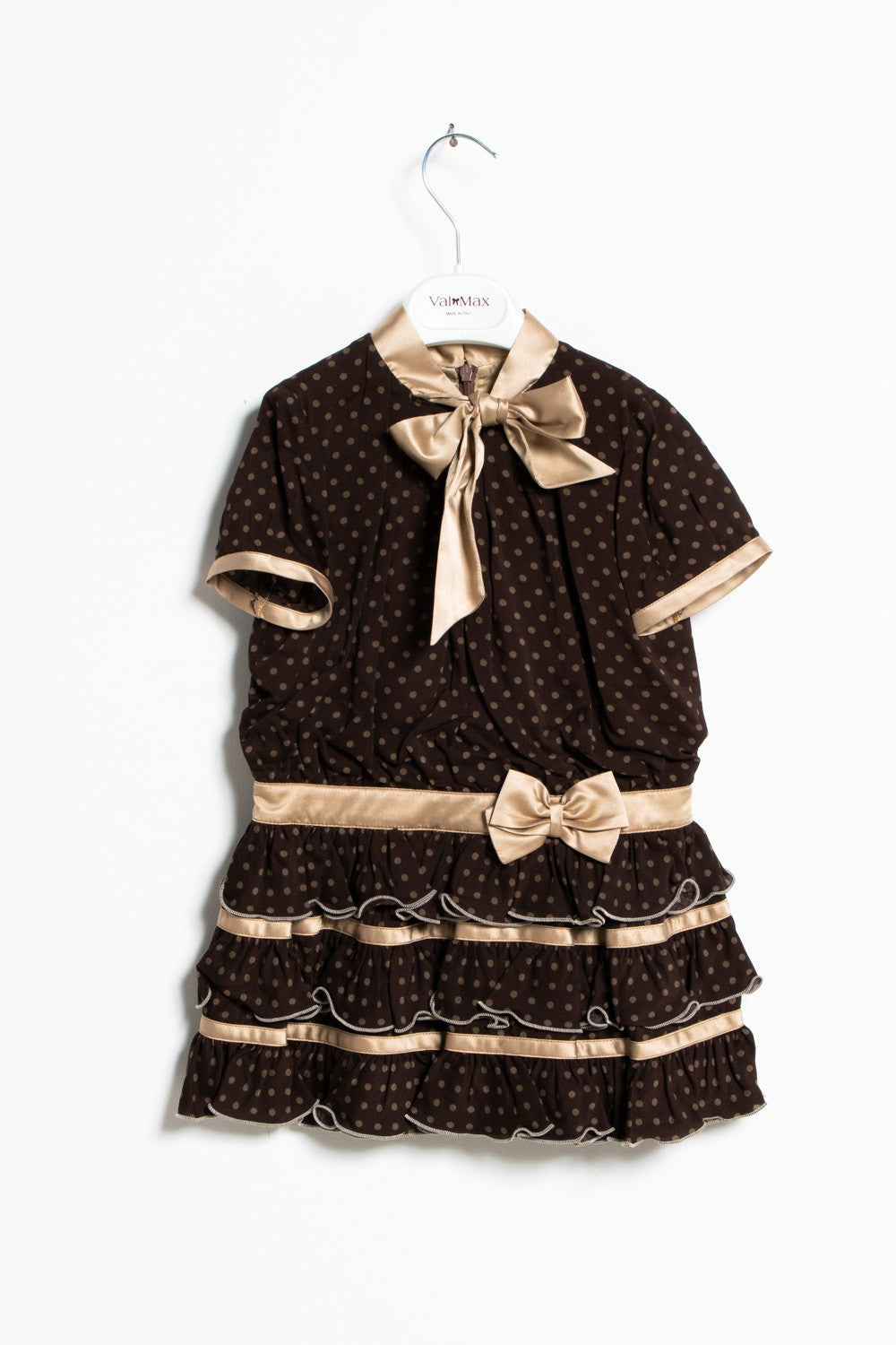 Short-sleeved dress with polka dot print, satin ribbons and bows.