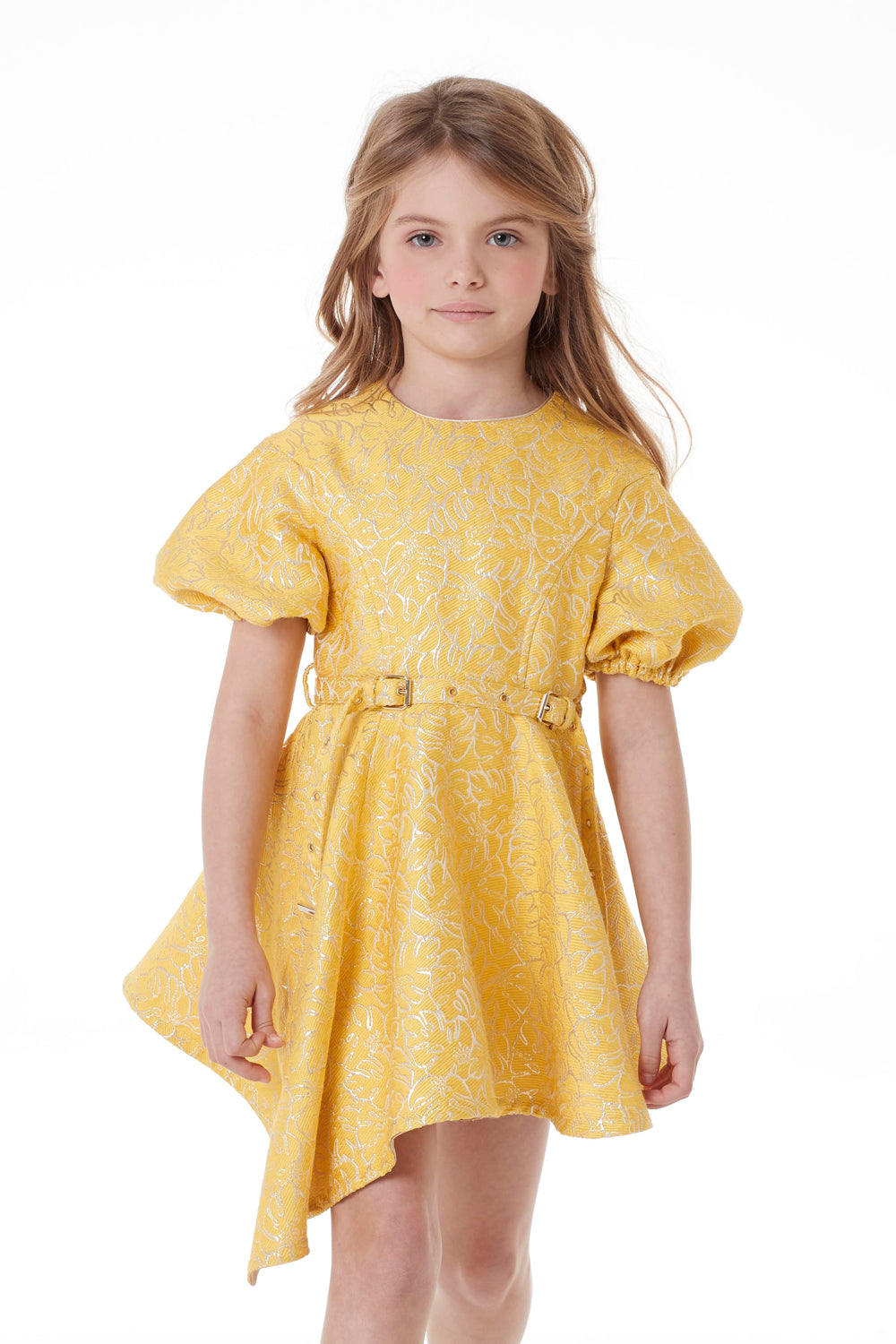 Lurex jacquard dress with puffed sleeves. Asymmetrical skirt and belted waist. Zip closure at the back.