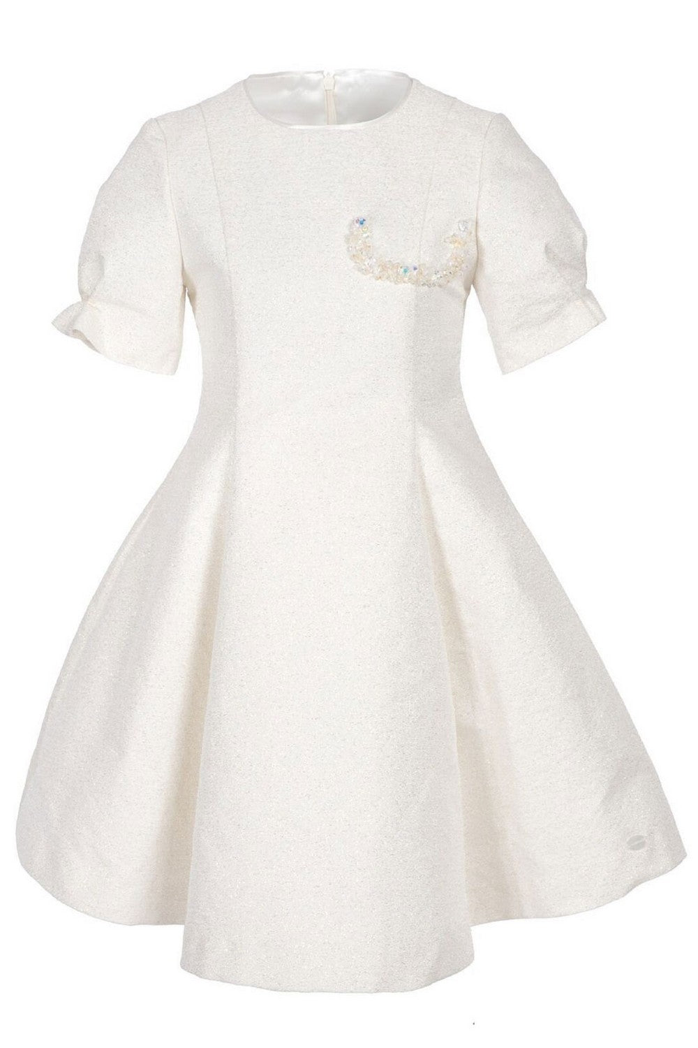 Short-sleeved redingote dress with crystal appliqués and invisible zip on the back.