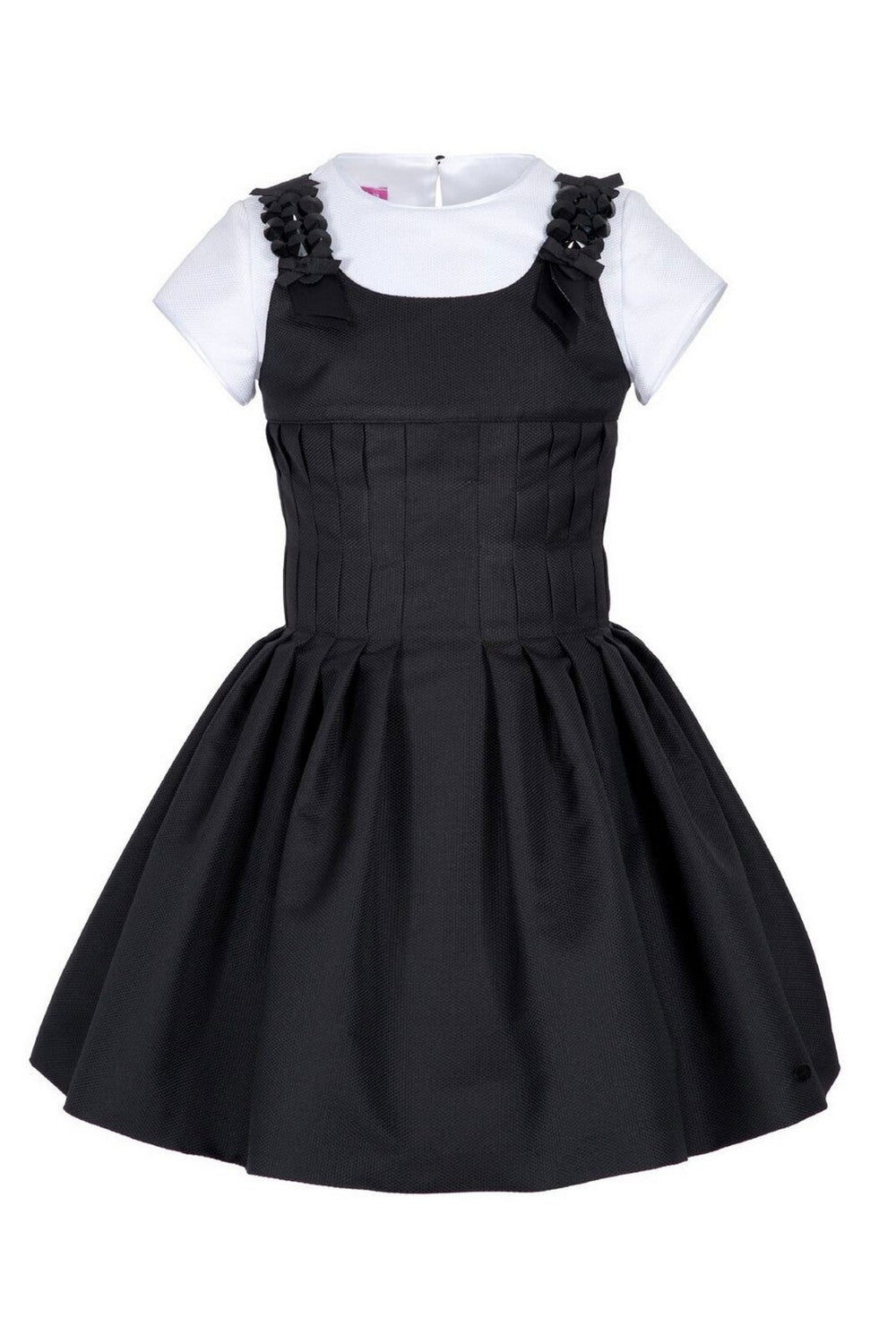 Short-sleeved dress with contrasting details, bows on the shoulders, a wide pleated skirt and an invisible zip on the back.