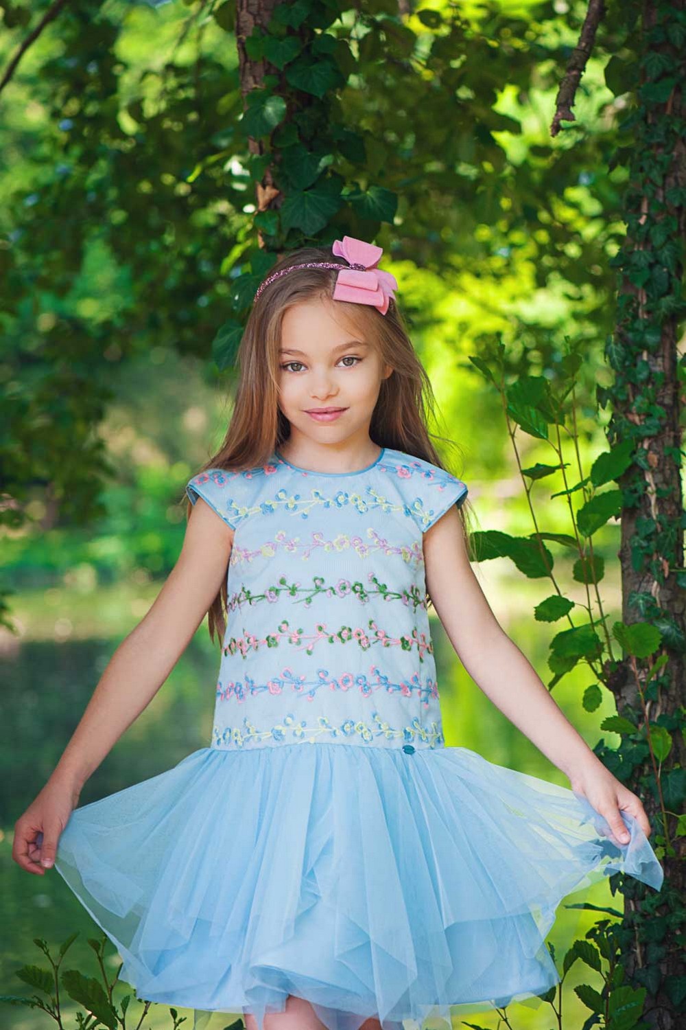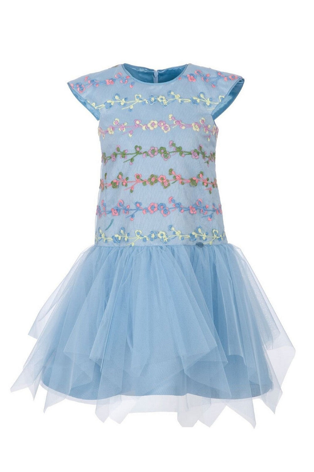 Dress with cap sleeves, bodice embellished with embroidered bows, wide tulle skirt and invisible zip on the back.