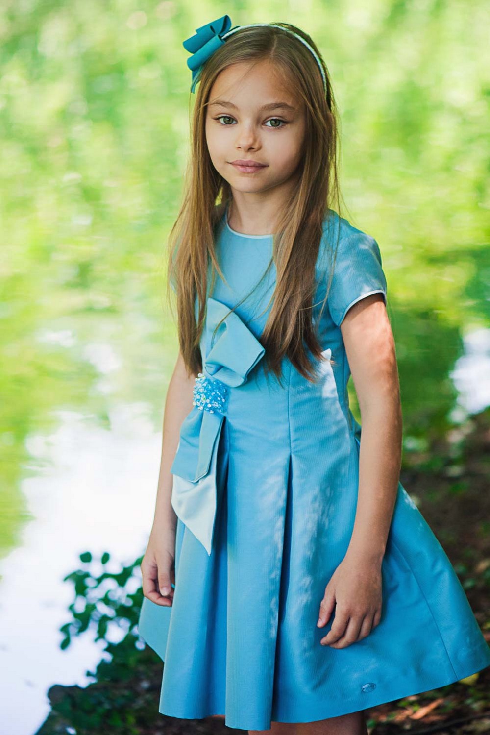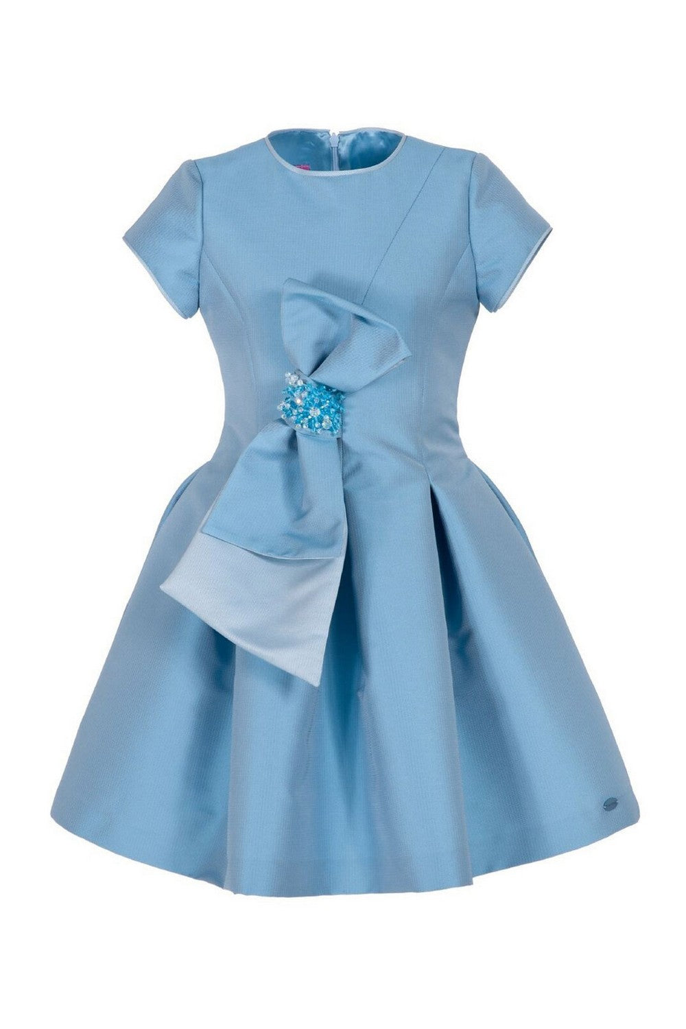 Short-sleeved dress with wide pleated skirt, maxi beaded bow on the front and invisible zip on the back.