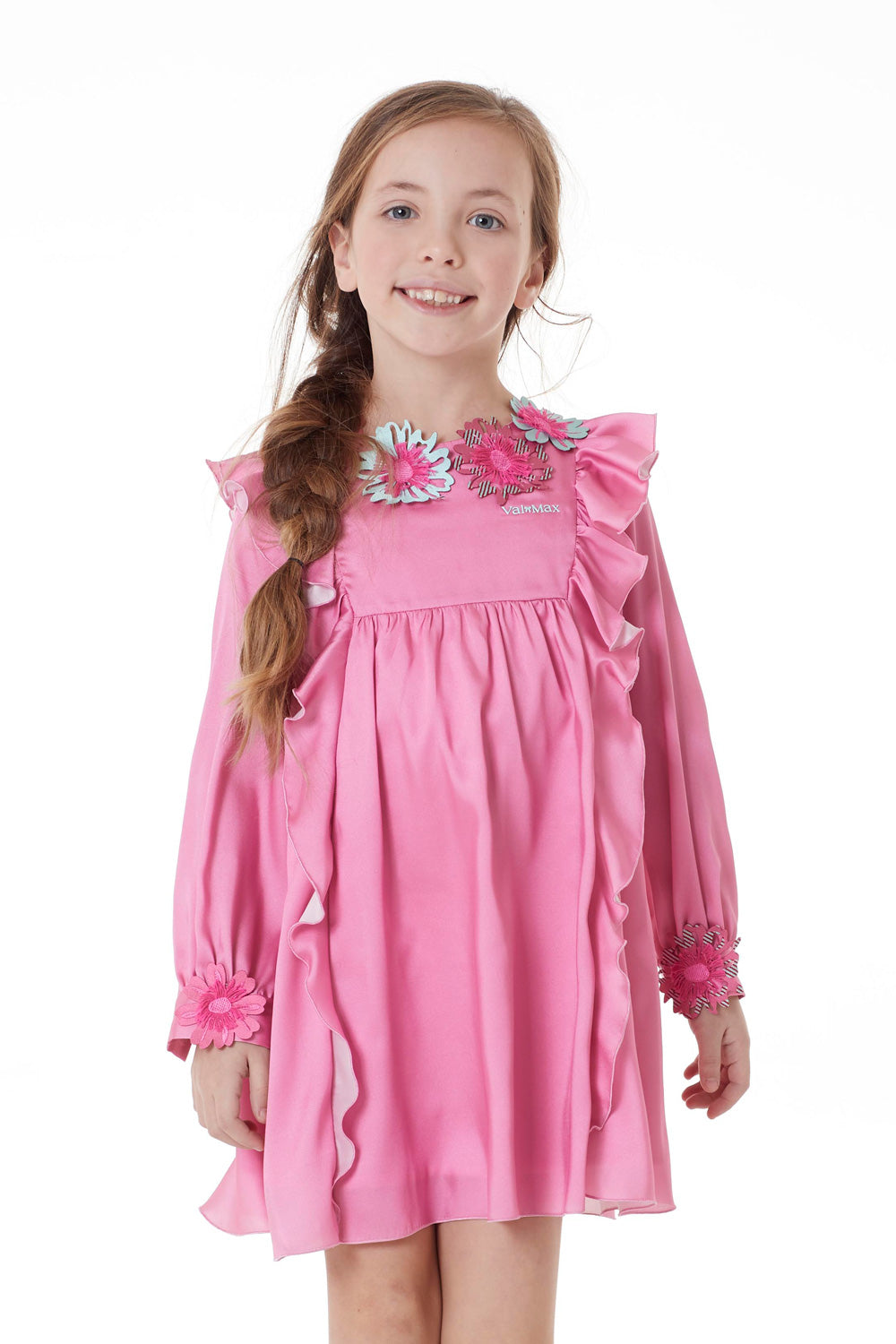 Long-sleeved satin dress with gathered waist, ruffled detail, and floral appliqués.