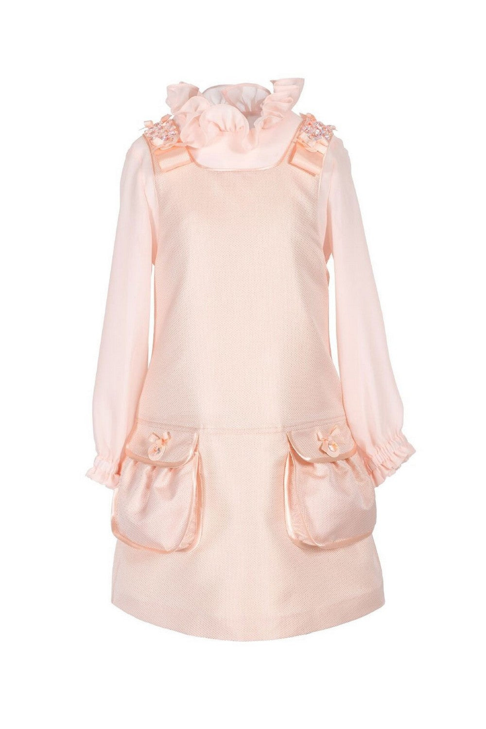 Long-sleeved dress with gathered collar and cuffs, two front pockets, embellished with bows and beads on the shoulders.