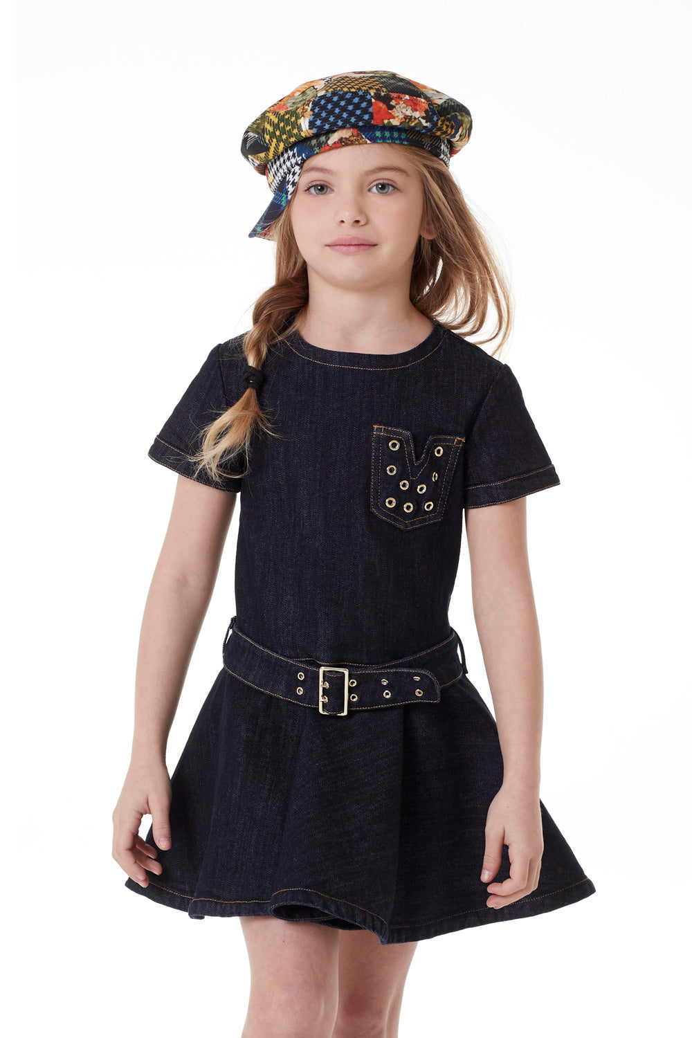 Short-sleeved denim dress with a pleated skirt. Belt loops and a studded pocket. Zip closure at the back.