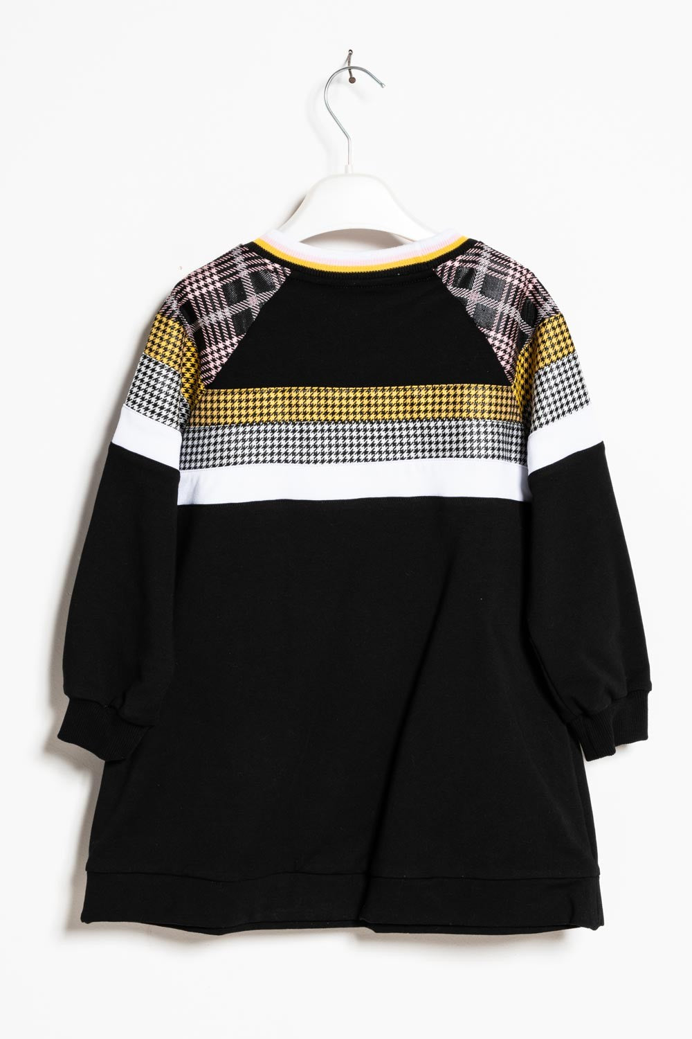 Long-sleeved sweatshirt dress with ribbed collar and houndstooth and tartan details.