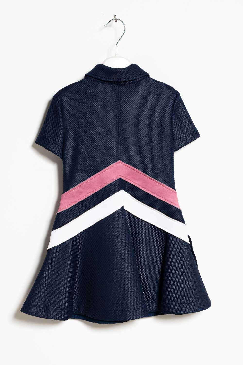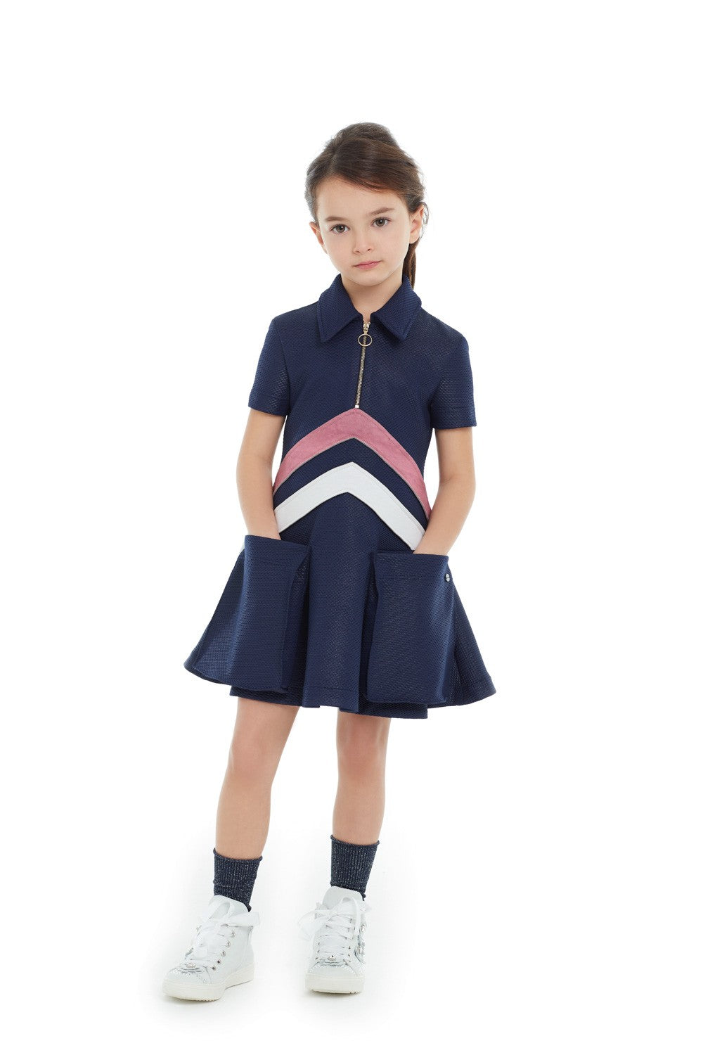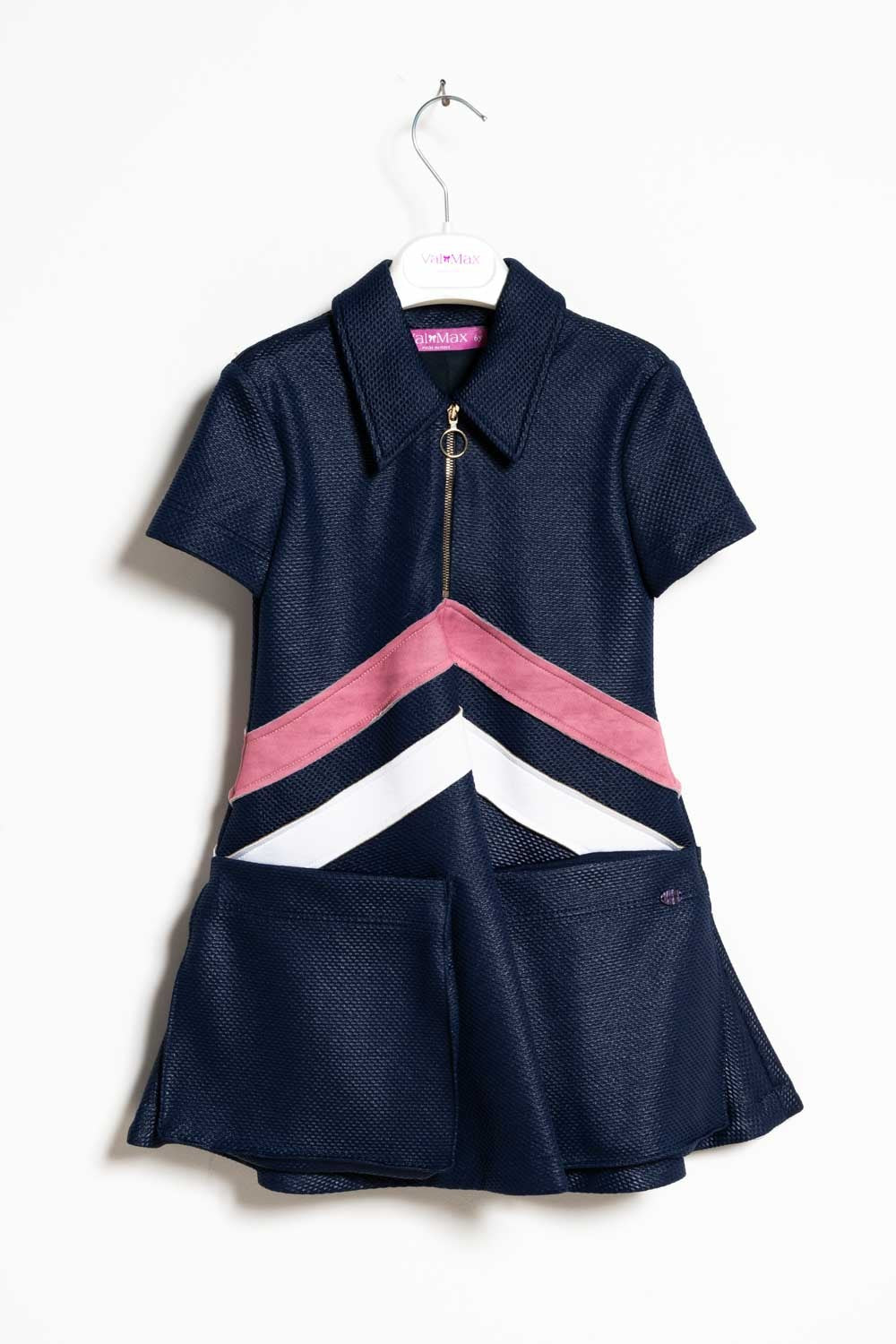 Short-sleeved mikado dress with collar, front zip fastening, contrasting details and two front pockets.