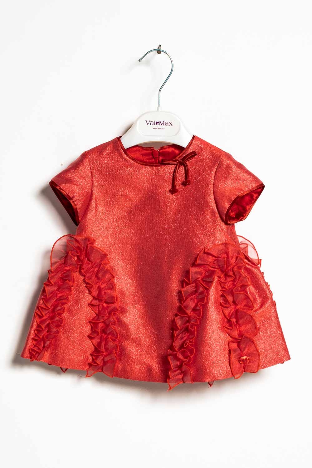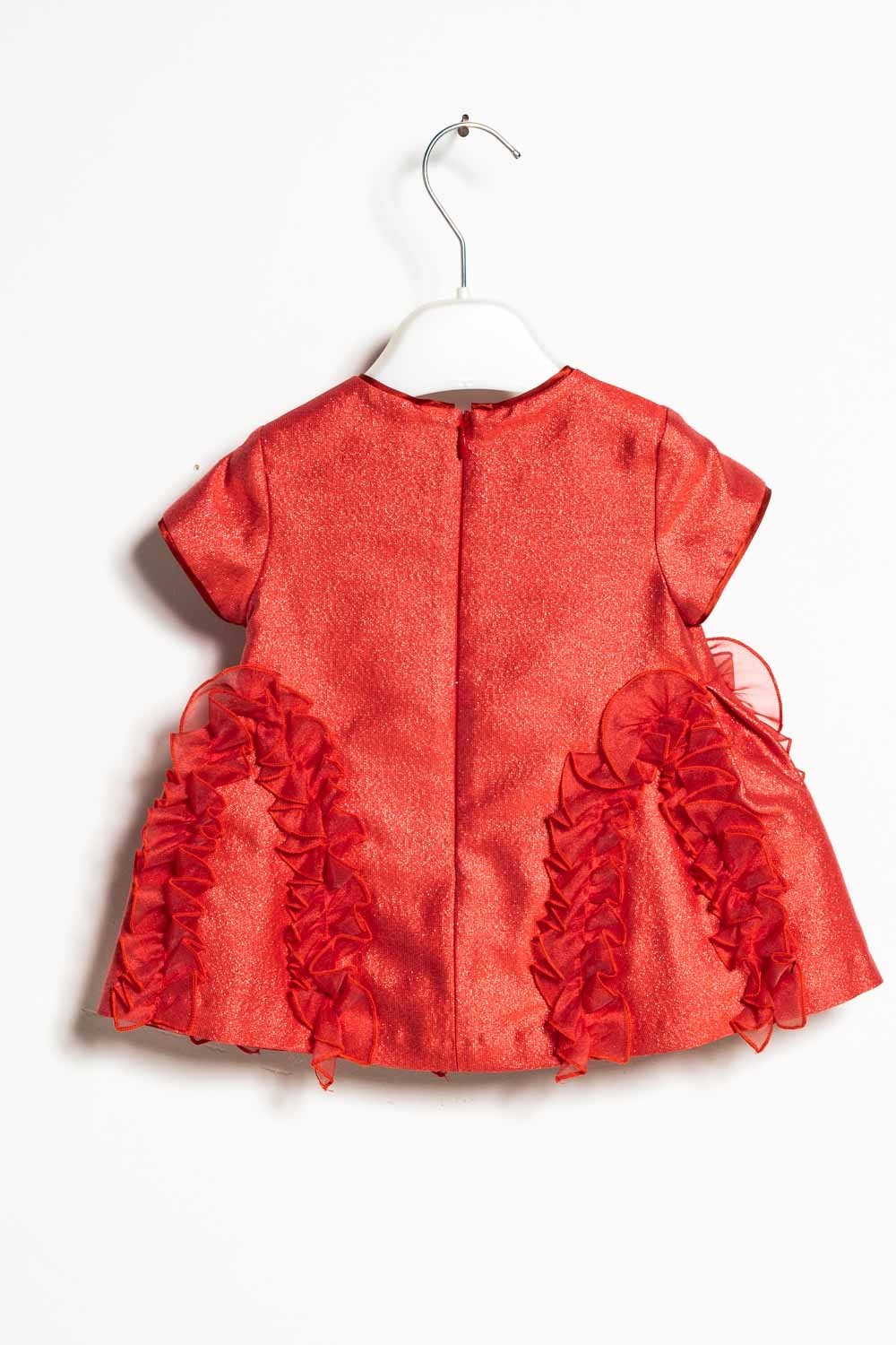 Short-sleeved mikado lurex dress with ruffles, side bow on the neck and invisible zip on the back.
