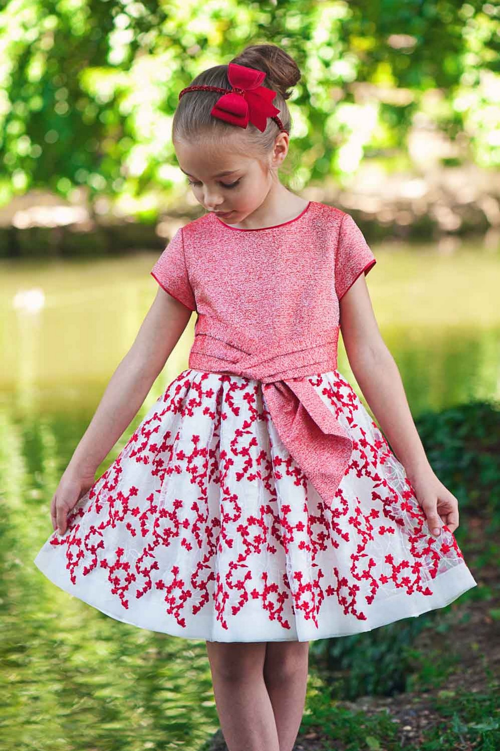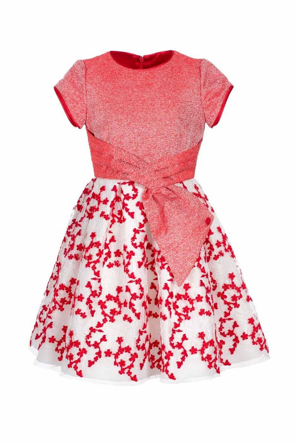 Short-sleeved dress with glittery fabric bodice, wide embroidered tulle skirt, crossover waistband and invisible zip on the back.