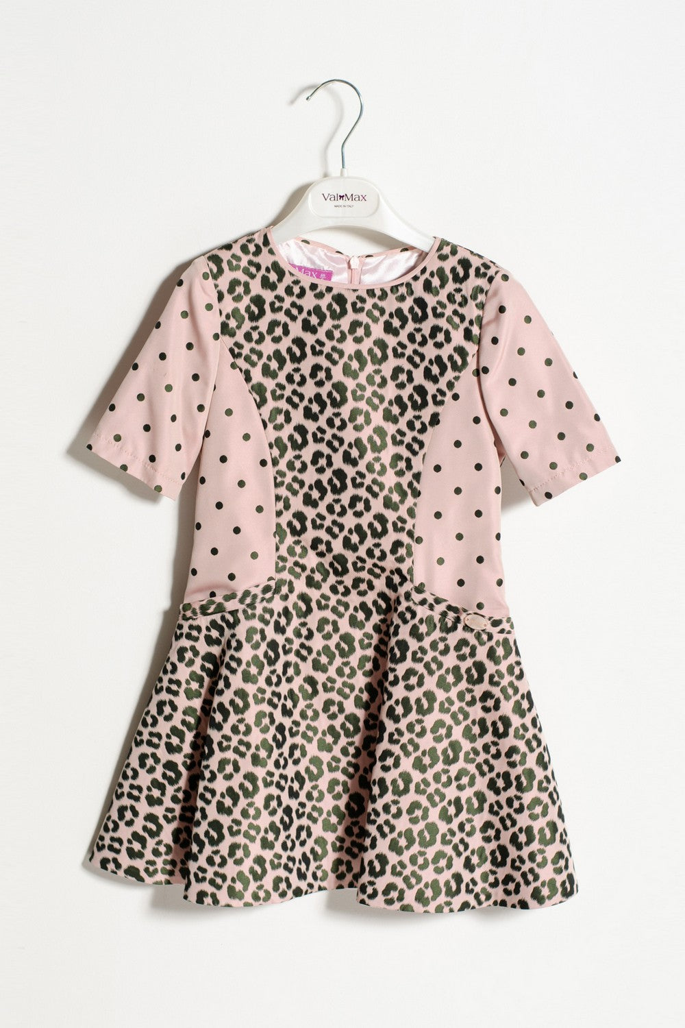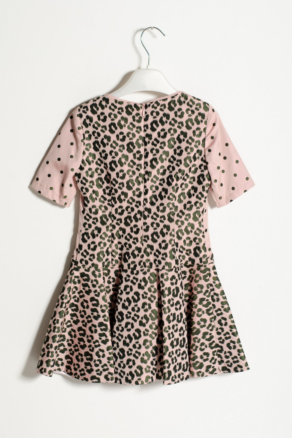 Short-sleeved dress in leopard print fabric with polka dot inserts.