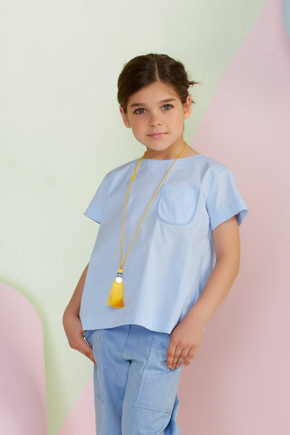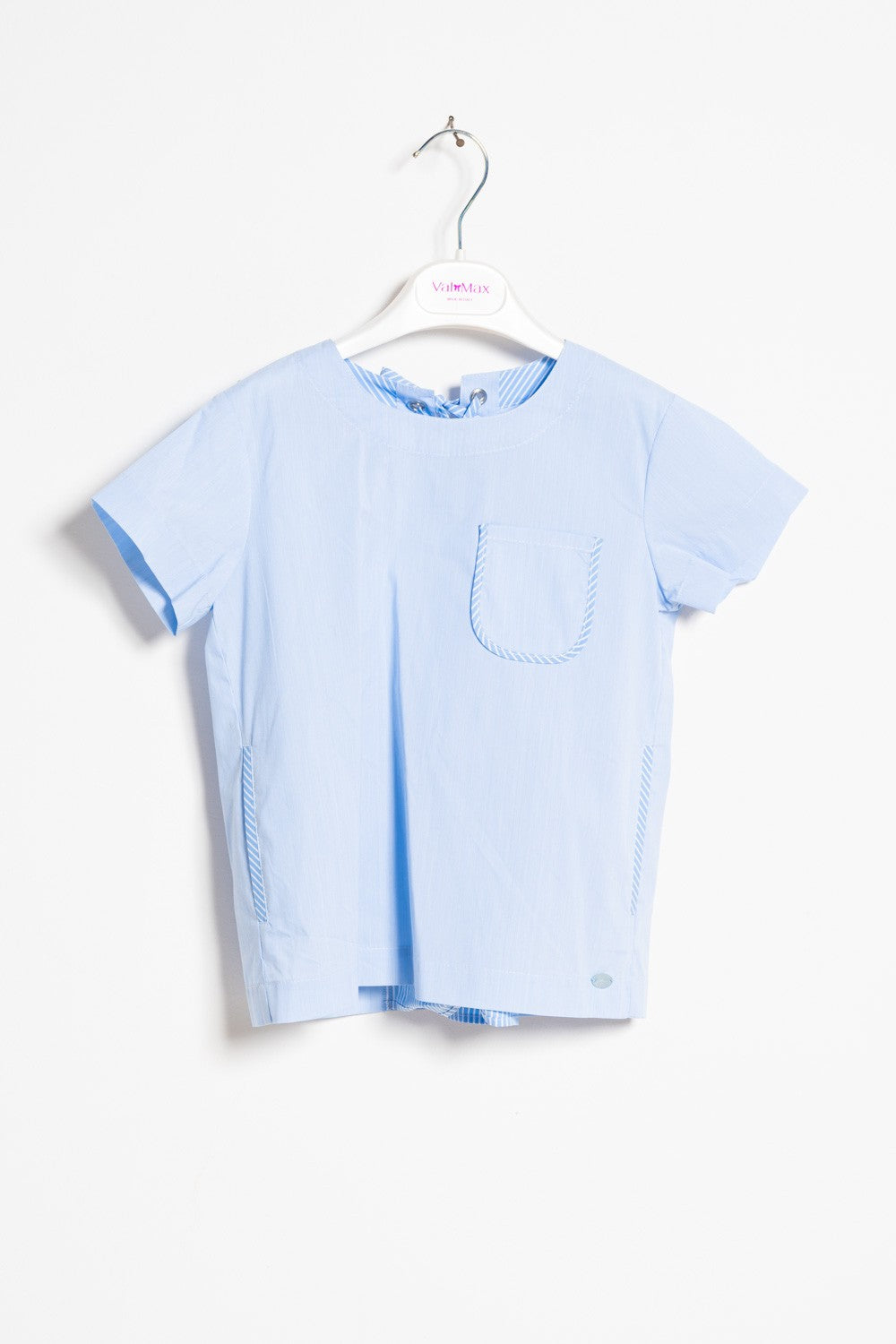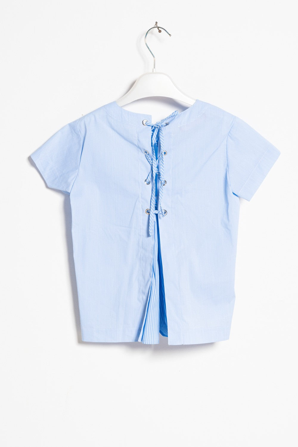 Short-sleeved T-shirt in cotton poplin with front pocket and back fastening with woven bows.