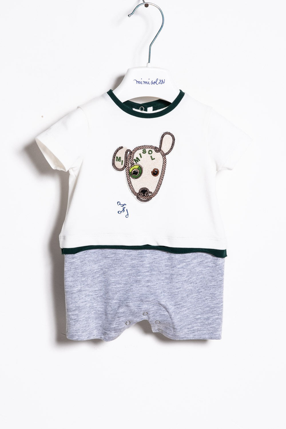 Short-sleeved jersey jumpsuit with front patch and snap button fastening at the back.