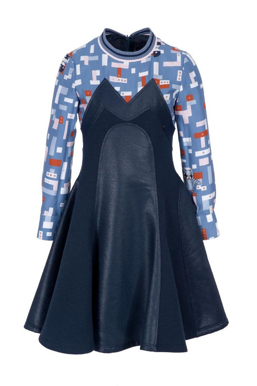 Abito a manica lunga fantasia con ampia gonna a pieghe in felpa e simil pelle, collo a costine e zip invisibile sul dietro.