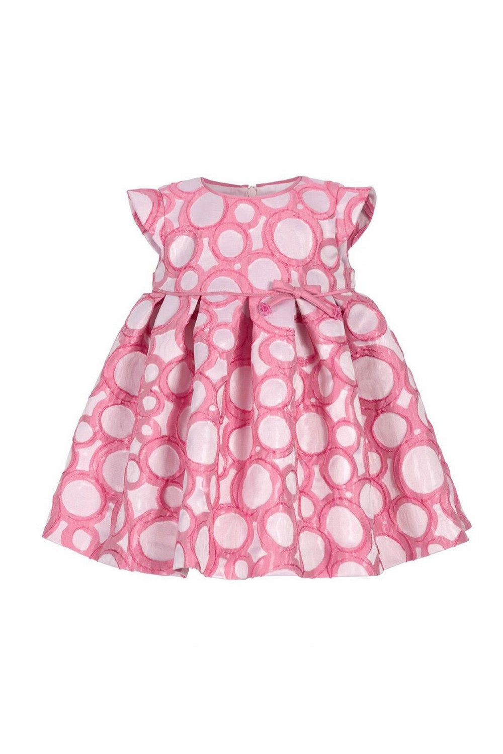 Abito con maniche ad aletta, fantasia a cerchi, fiocchetto in vita e zip invisibile sul dietro.