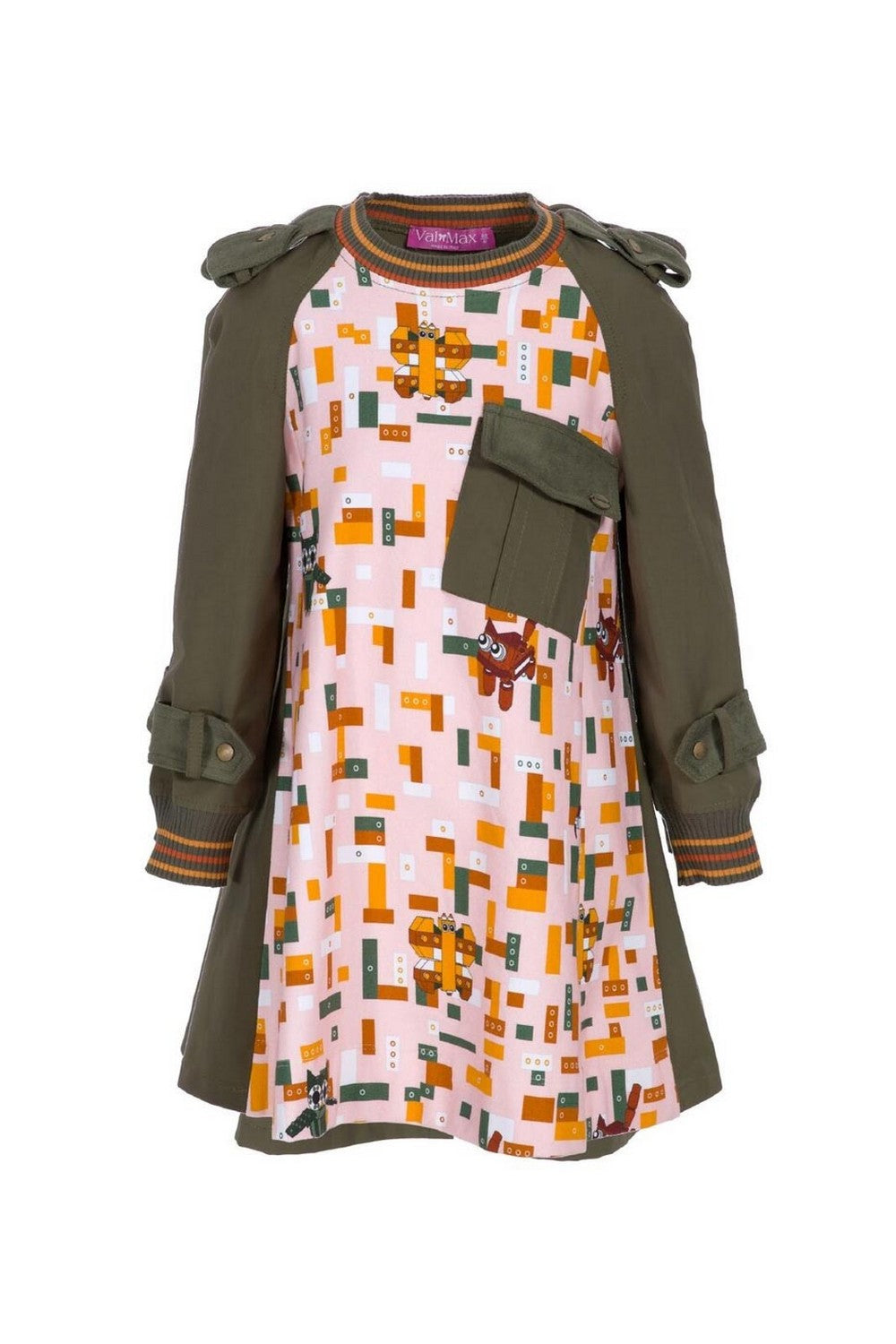 Abito a manica lunga fantasia con maniche e taschino frontale in simil pelle, polsini e collo a costine e alamari.