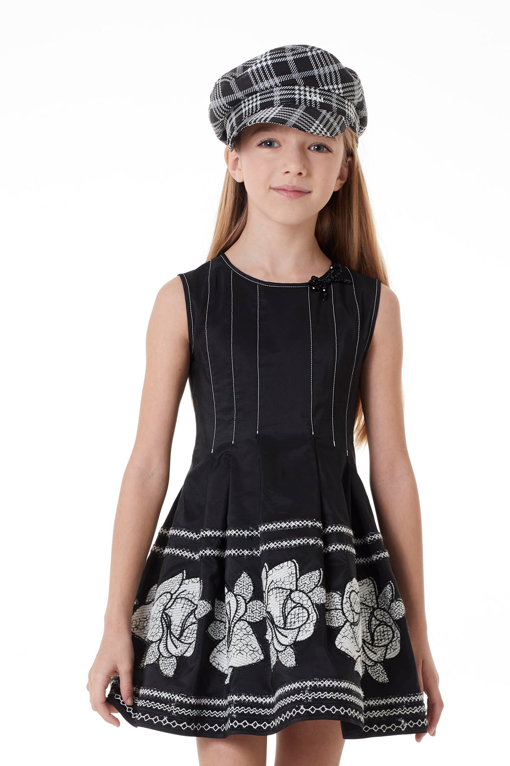 Abito smanicato con riprese e impunture a contrasto. Applicazione di ricami floreali sulla gonna.