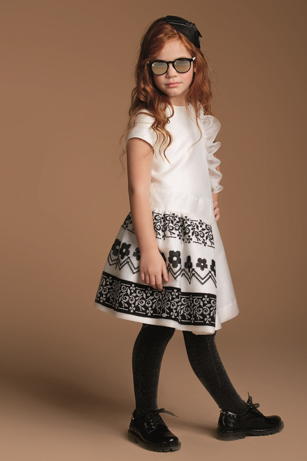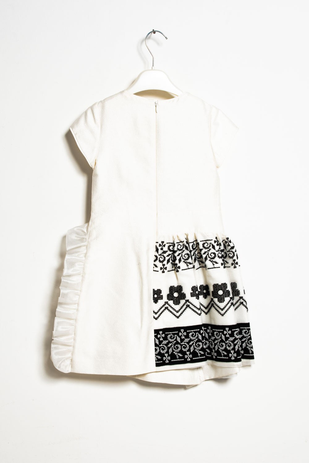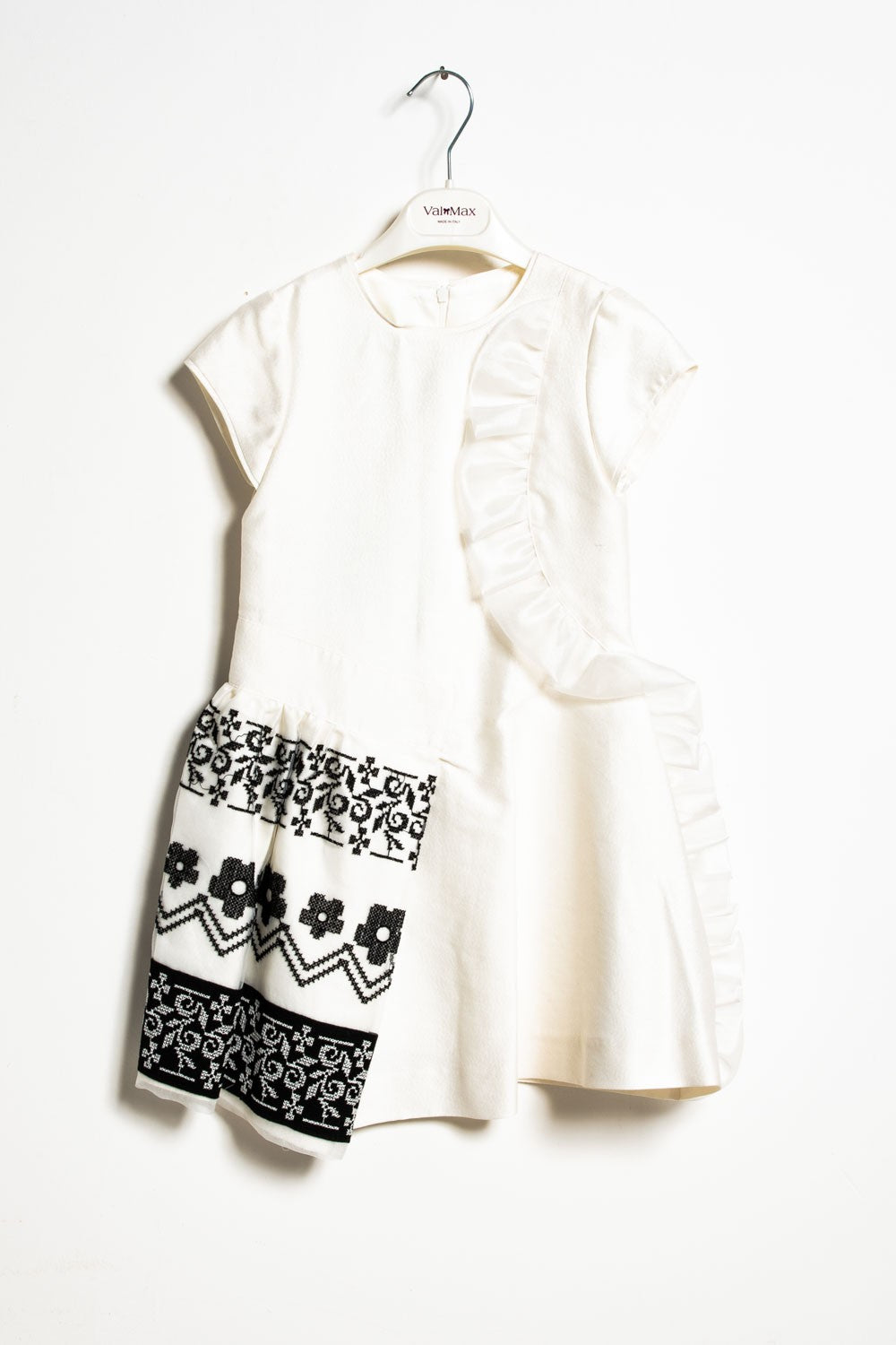 Abito a maniche corte con rouches, ricami punto croce a fiori e zip invisibile sul dietro.