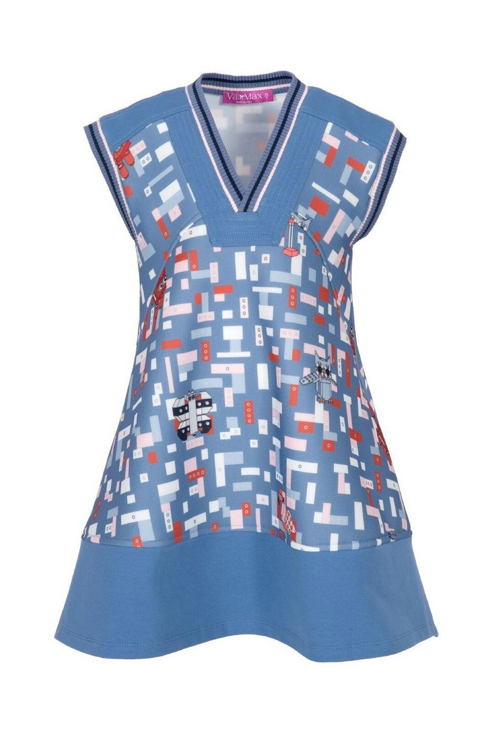 Abito lungo fantasia smanicato con scollo a V e orli a costine.