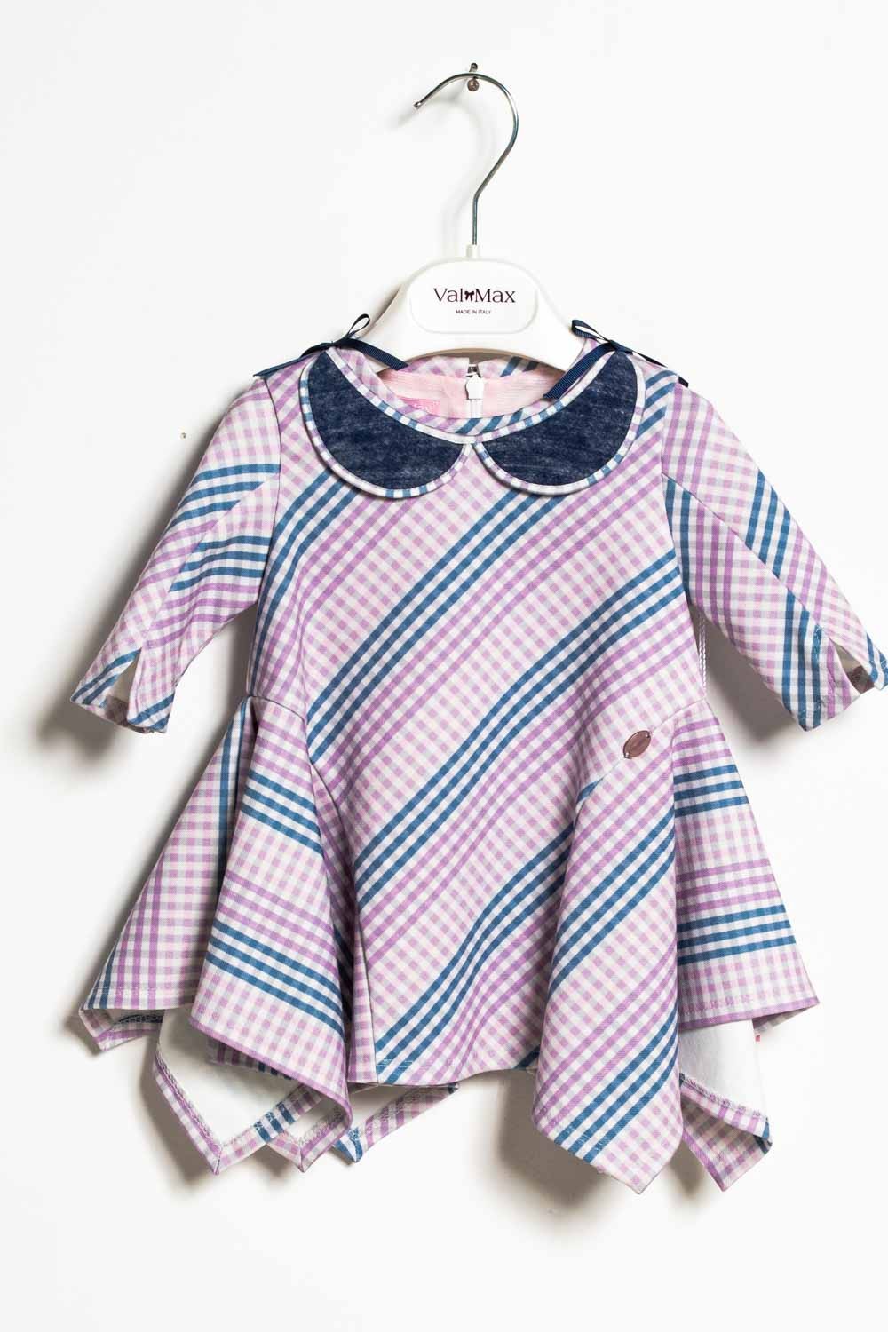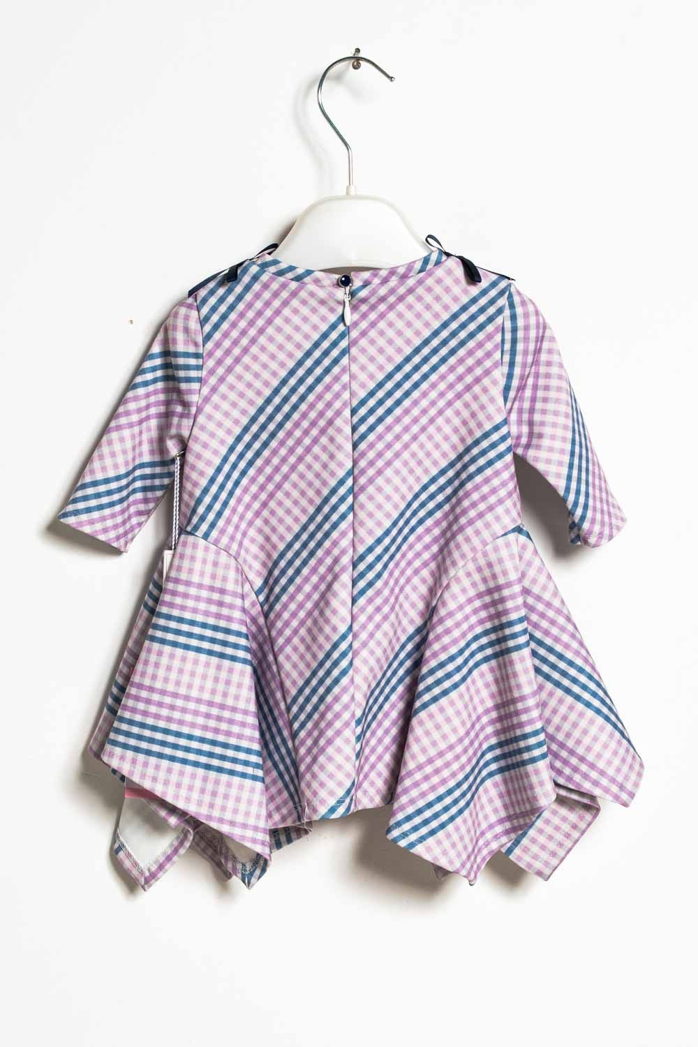 Abito con volant in fantasia a quadretti con maniche a tre quarti, collo alla Peter Pan impreziosito da due fiocchetti laterali e zip invisibile sul dietro,