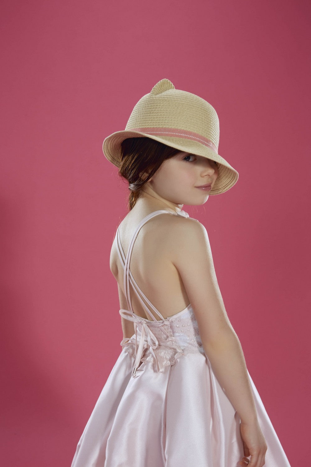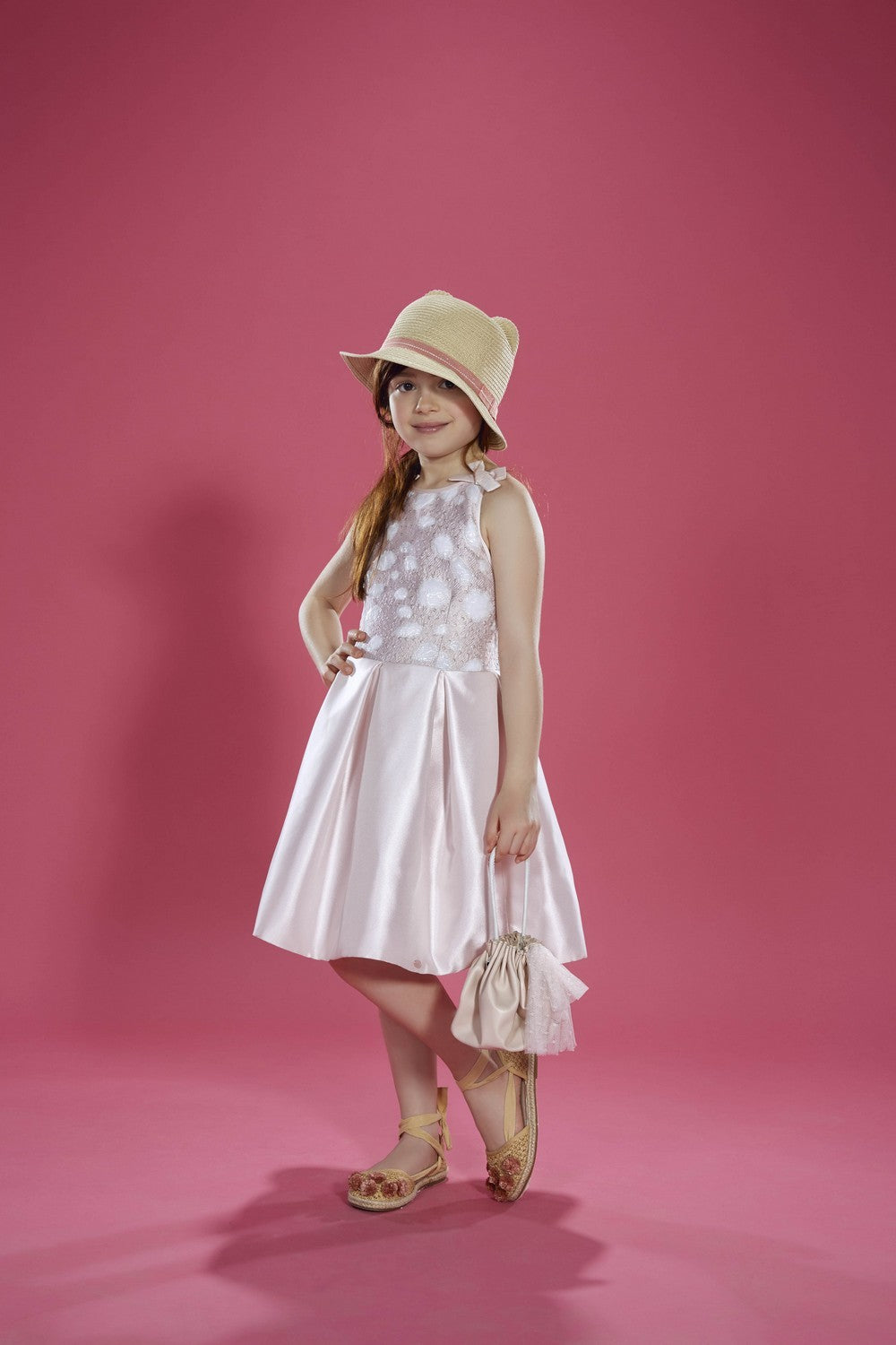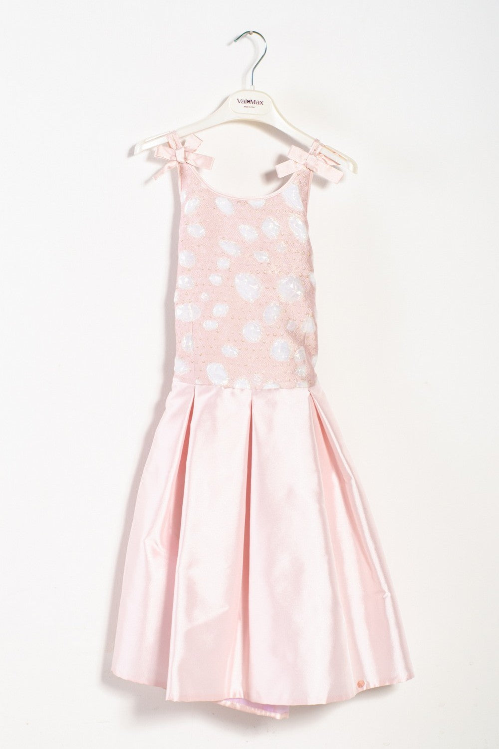Abito con scollo all'americana in tessuto satinato con gonna plissettata e inserto smock sul retro.