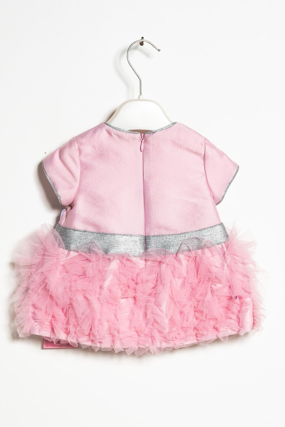 Abito a maniche corte con corpino in raso, gonna in tulle, dettagli in tessuto spalmato e zip invisibile sul dietro.
