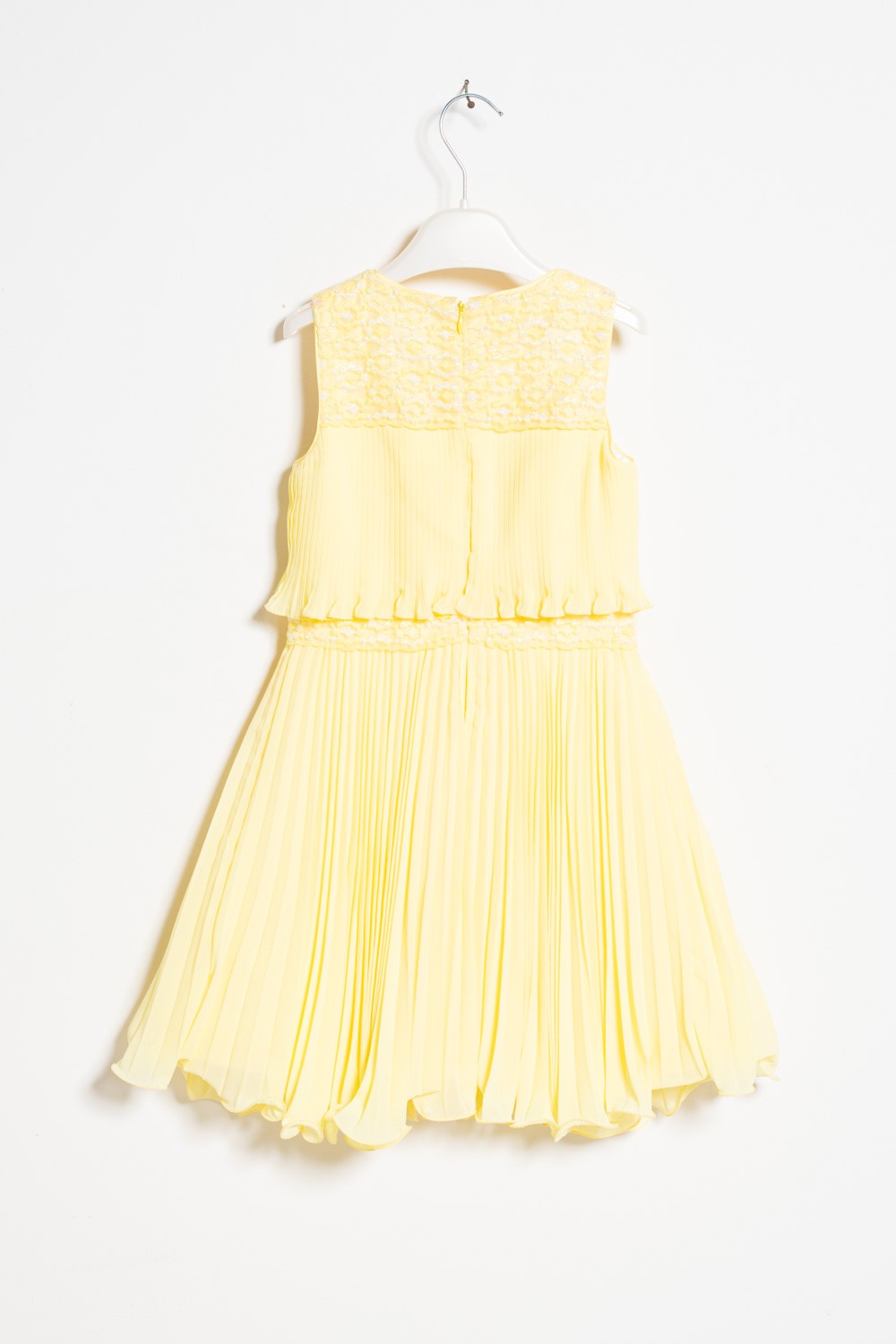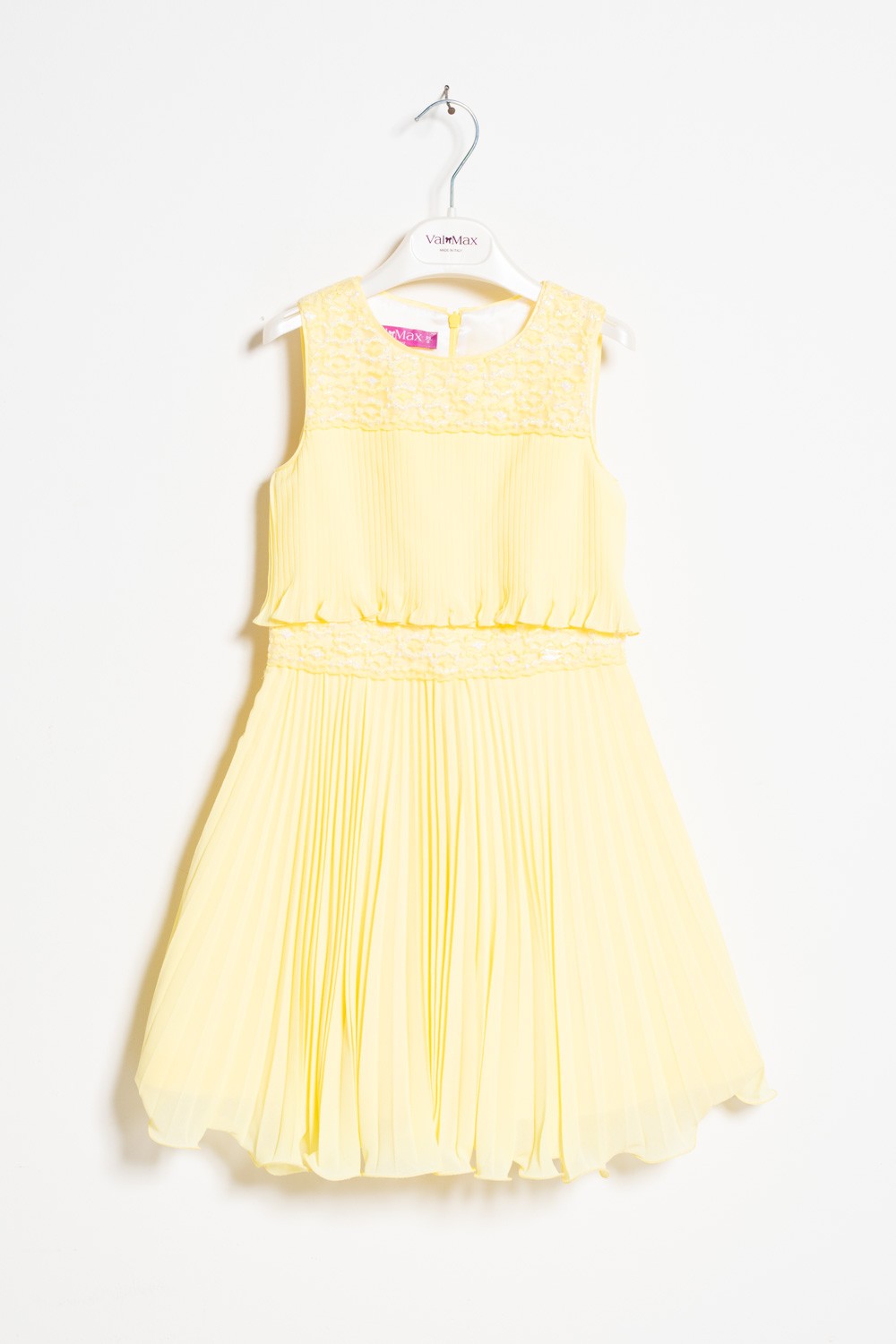 Abito in crepe plissettato con inserti in pizzo e zip invisibile sul dietro.