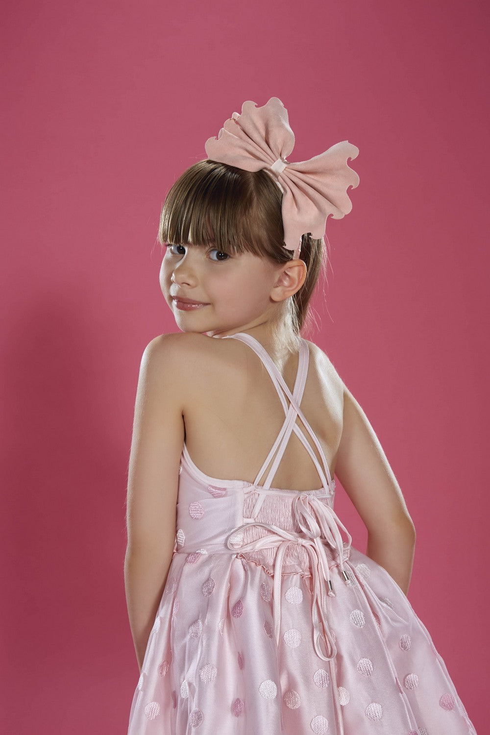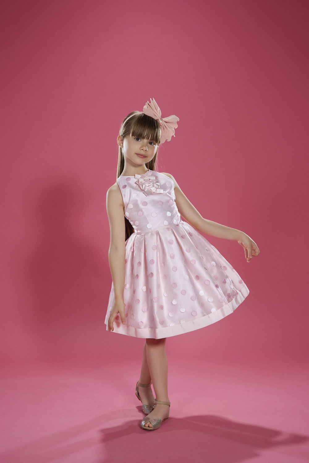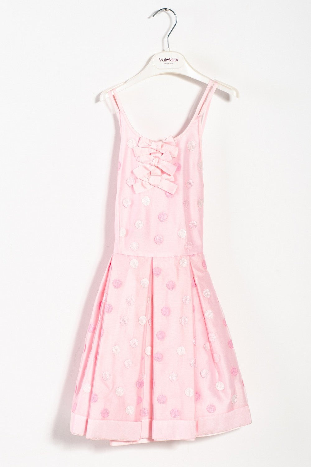 Abito halter in tessuto a pois con gonna plissettata e inserto smock sul retro.