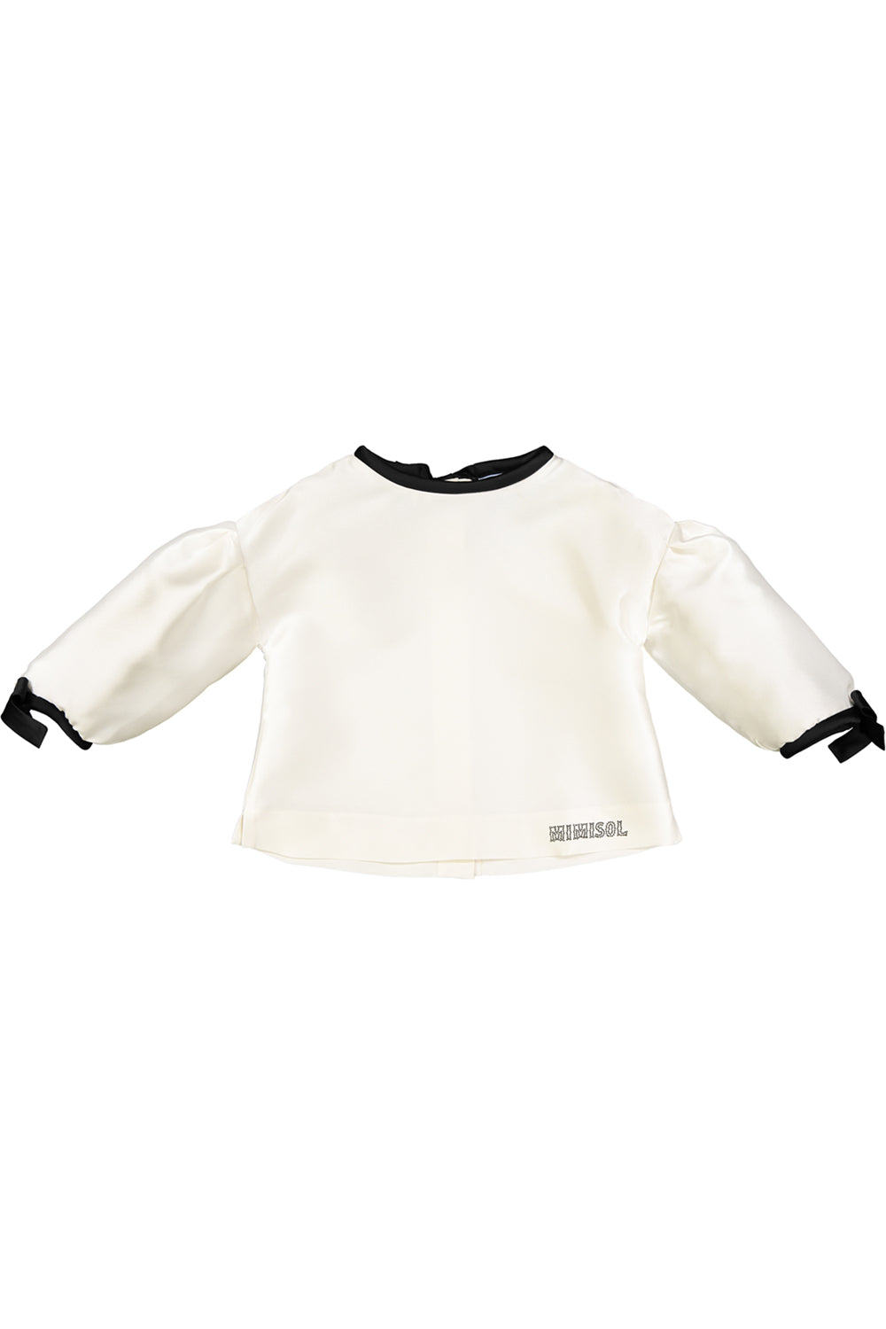 La camicia Mimisol in tessuto Mikado si rinnova, ha spalla scesa, manica a tre quarti e bordi imbottiti a contrasto. La tipica apertura con bottoncini si sposta sul retro mentre graziosi nastri da annodare decorano collo e polsini.
