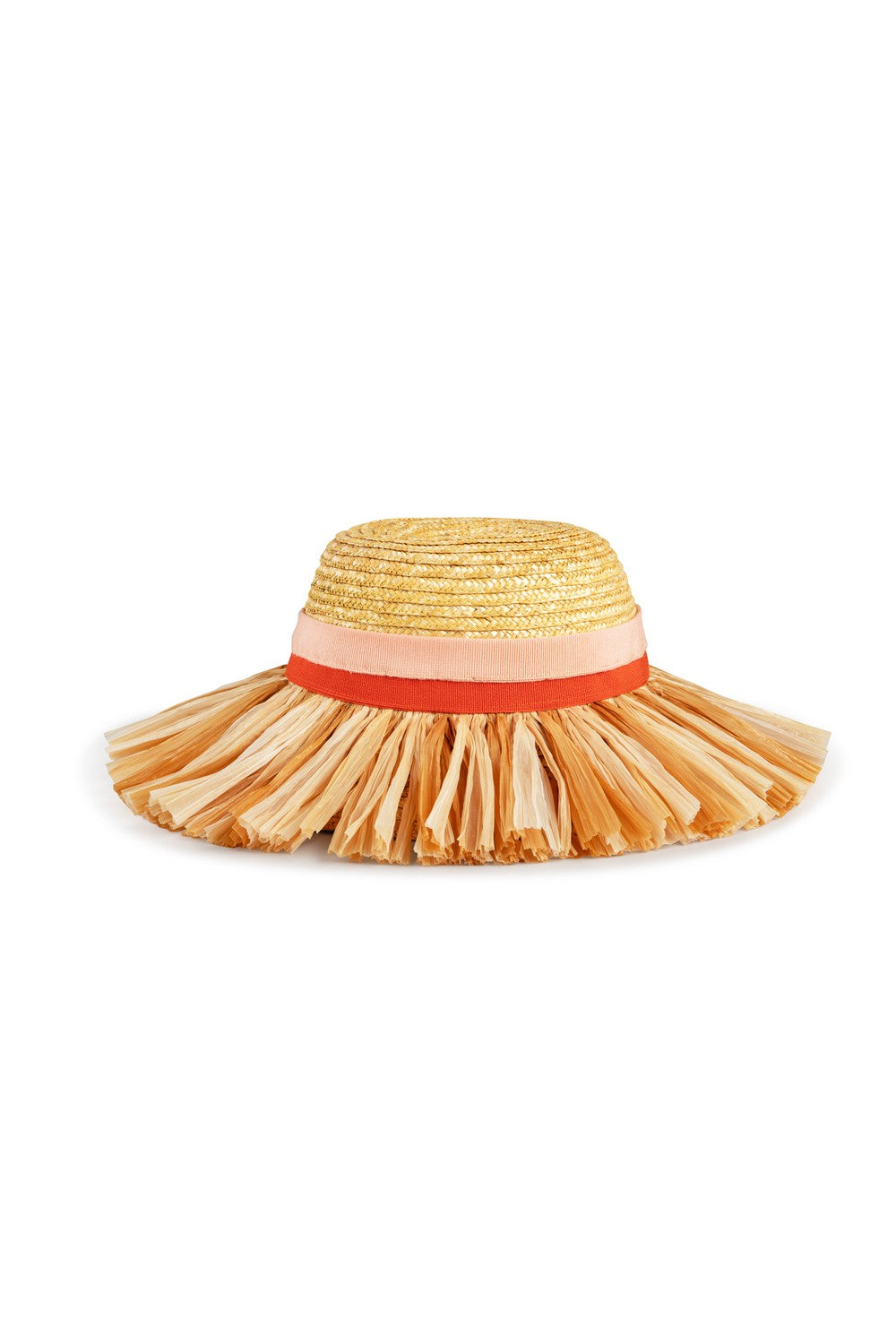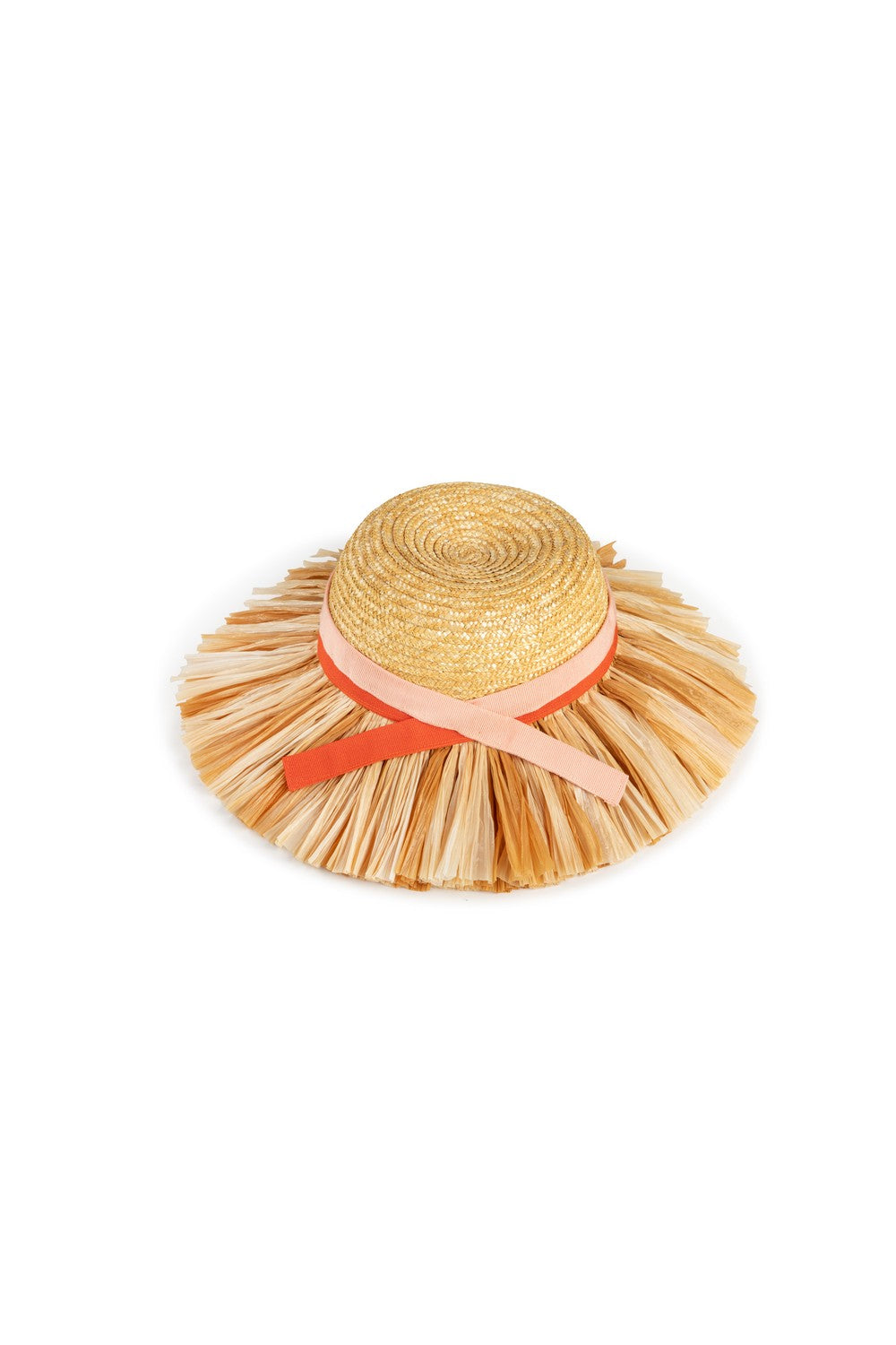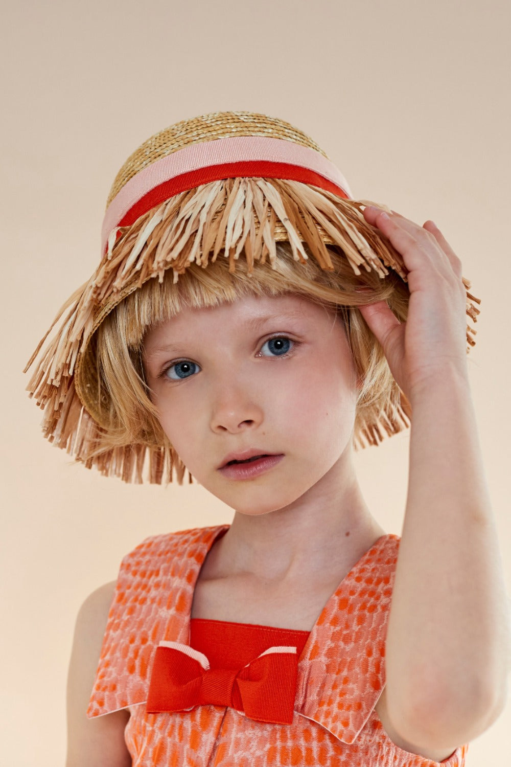 Una frangia di rafia si irradia sulla tesa della cloche in paglia intrecciata, due nastri di grosgrain completano il design raffinato.