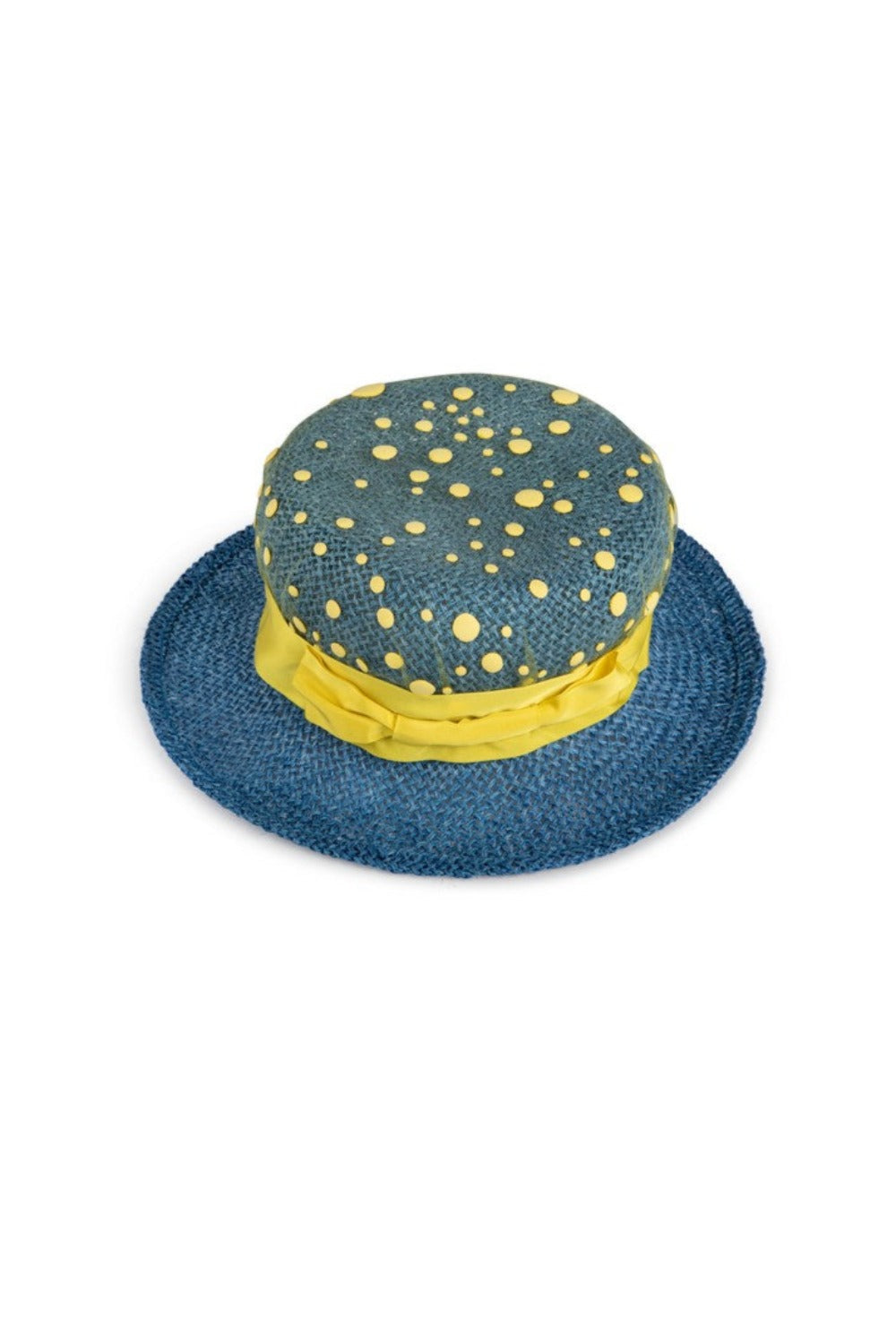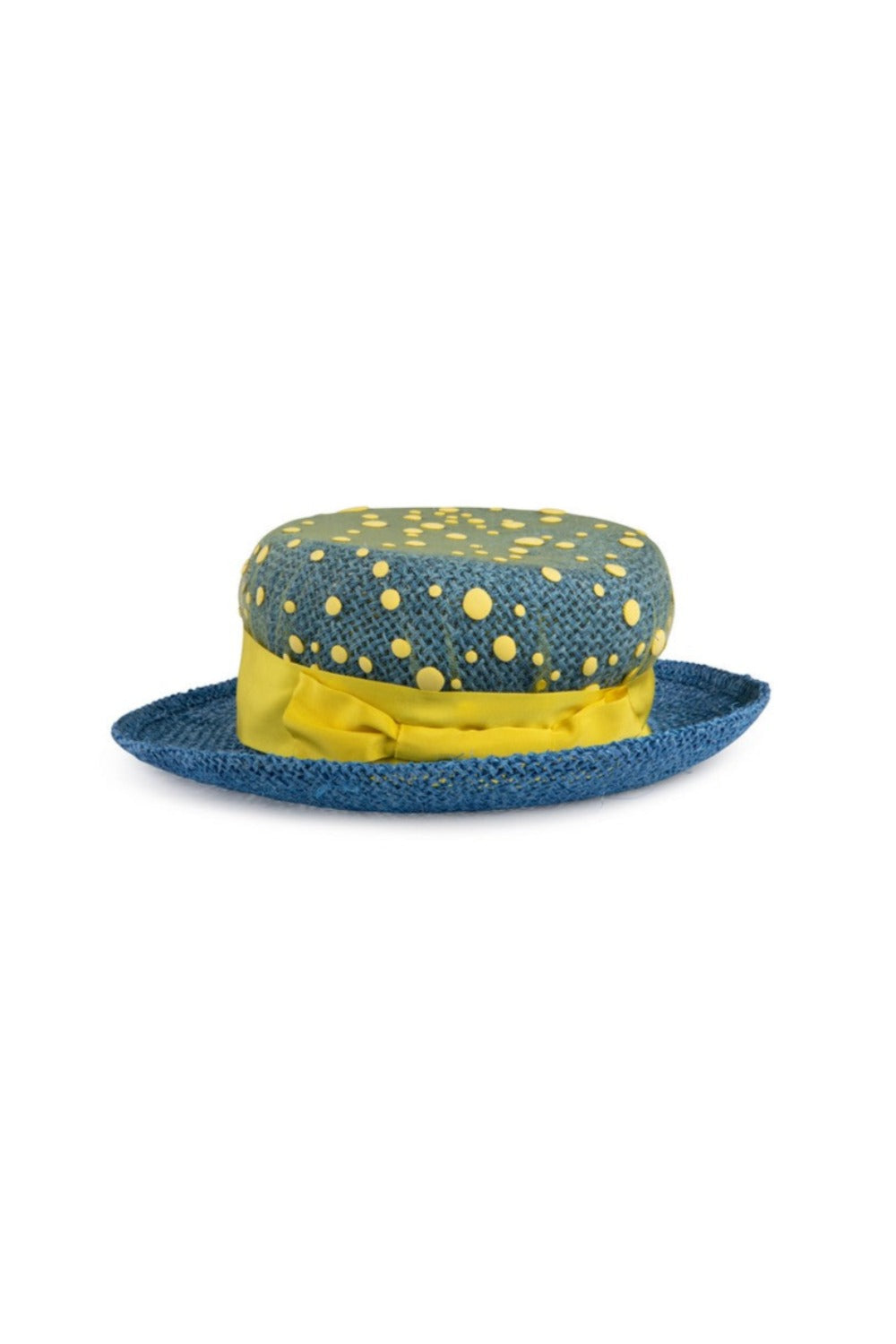 Rivestito di tulle a pois gialli 3D, il cappello fedora in paglia è rifinito da una banda e un fiocco in grosgrain.