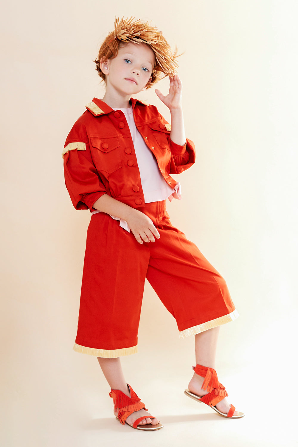 Per la collezione PE20 l’immaginario Mimisol è influenzato dal tema del viaggio: il passaggio nel continente africano regala al pantalone in gabardina di cotone divertenti frangettine di rafia.
