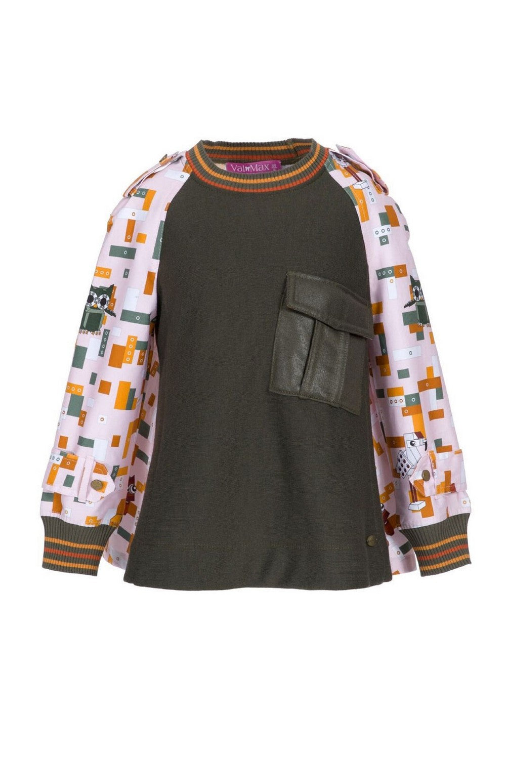 Felpa a maniche lunghe in panno e neoprene stampato fantasia con maxi taschino frontale e orli a costine.