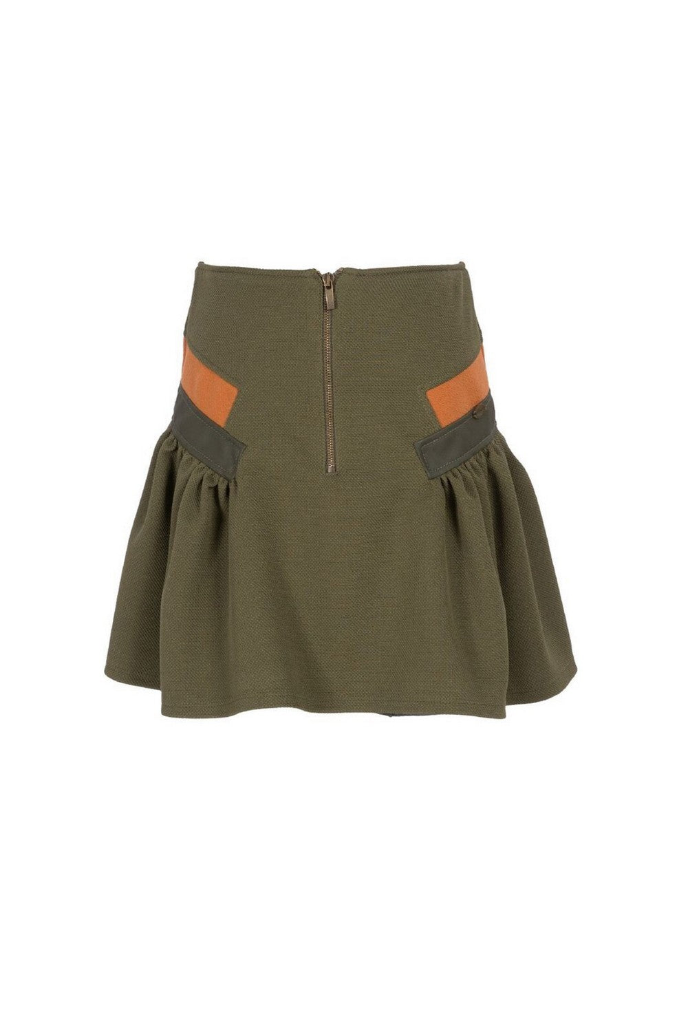 Gonna arricciata sui lati con dettagli a contrasto e chiusura frontale con zip.