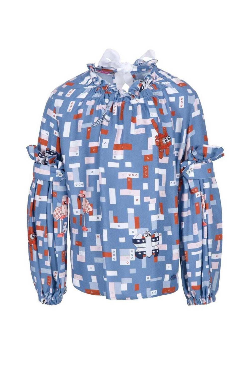 Maglia a manica lunga fantasia con collo e polsini arricciati e chiusura a fiocco sul dietro.