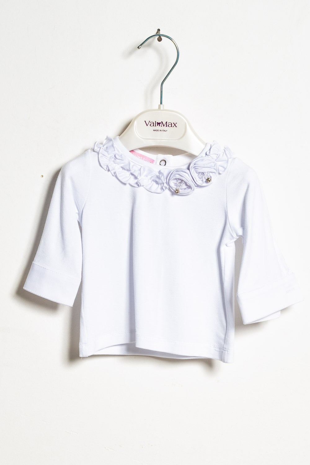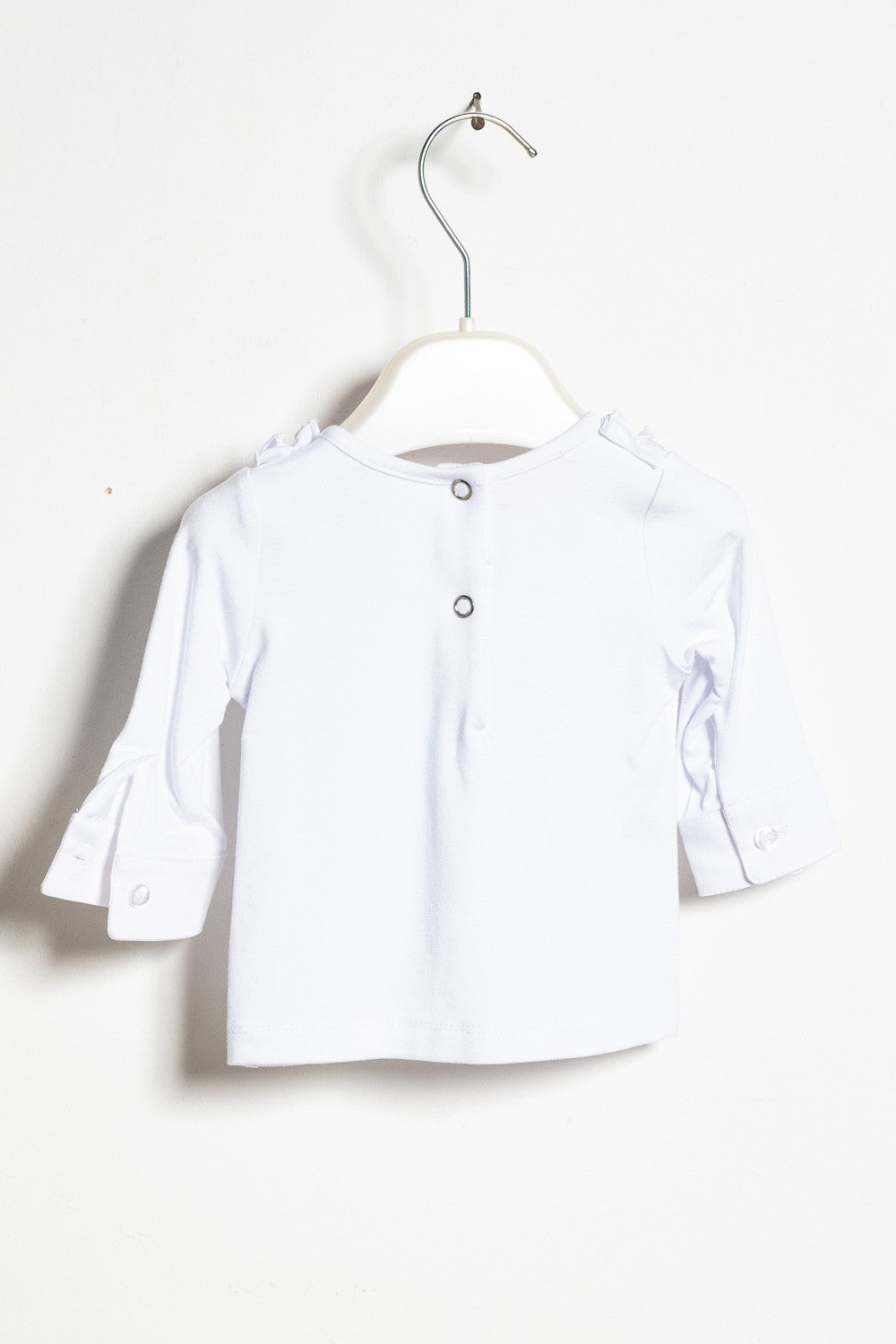 Maglietta a maniche lunghe con decorazioni in tessuto e perline sul collo, bottoncini ai polsini e sul dietro.