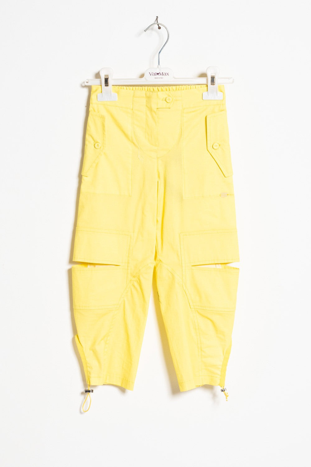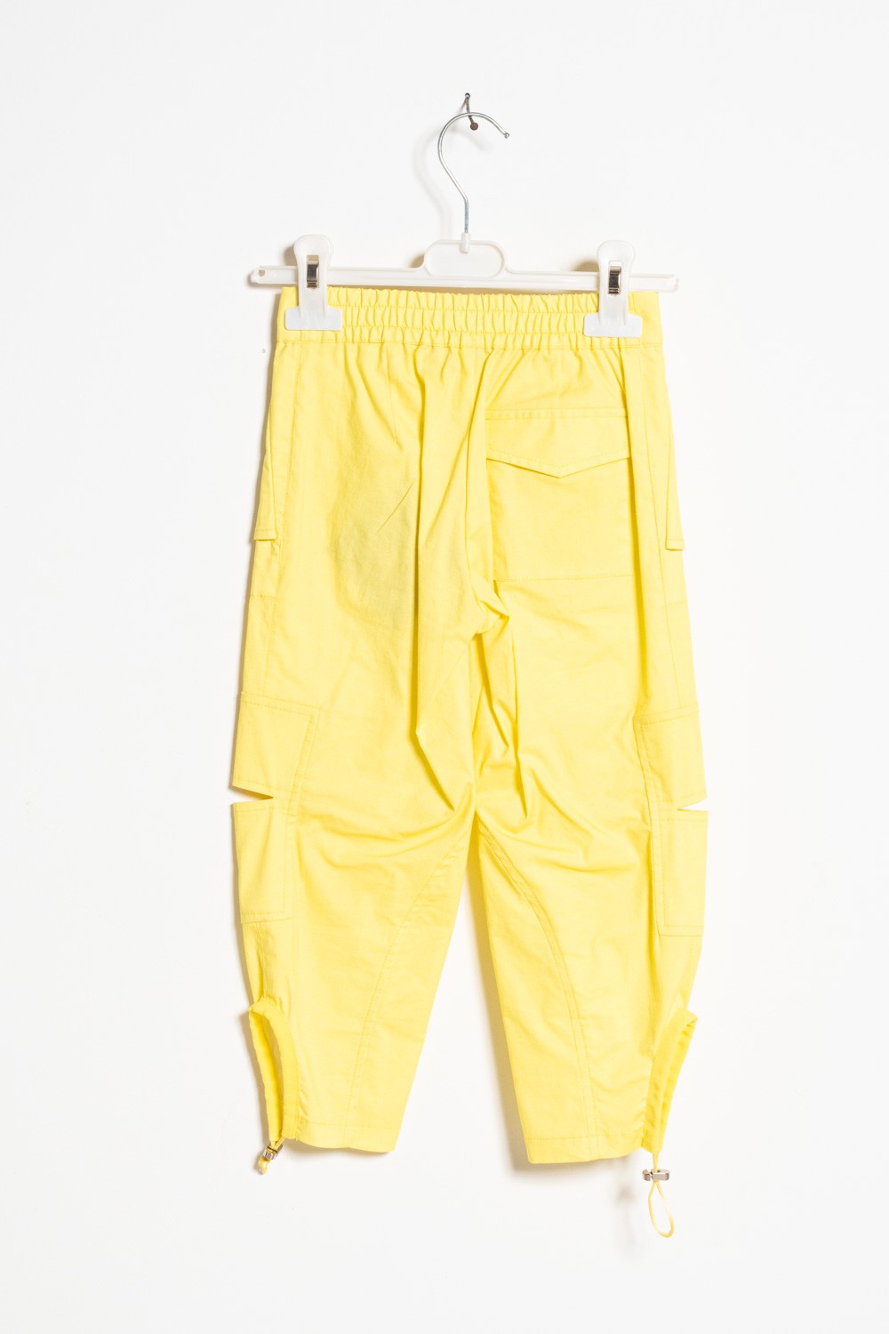 Pantaloni lunghi arricciati in vita con bottone frontale, tagli laterali e caviglie con coulisse.