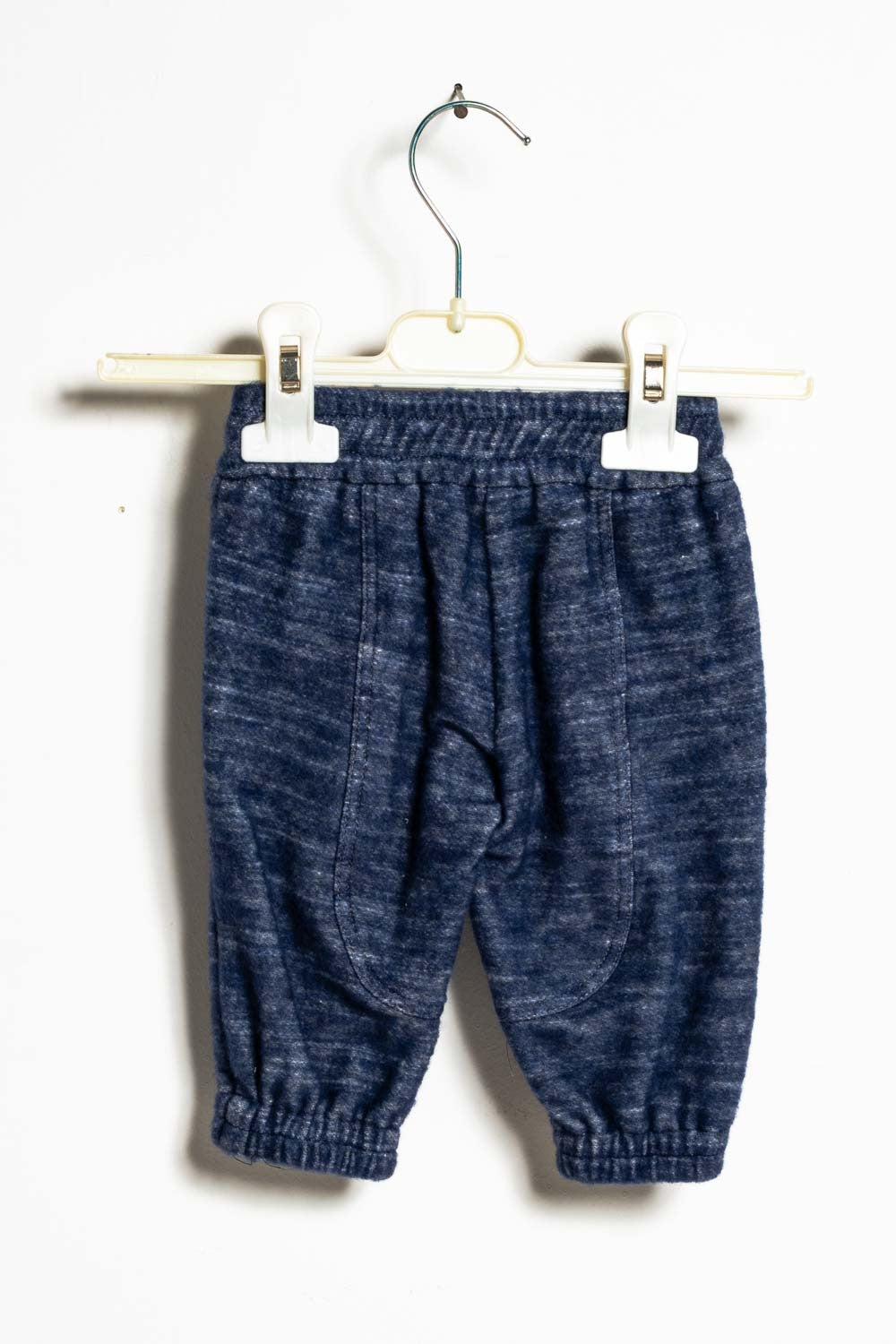 Pantaloni lunghi con stampa melange, bottone e tasche frontali, caviglie e vita arricciati.